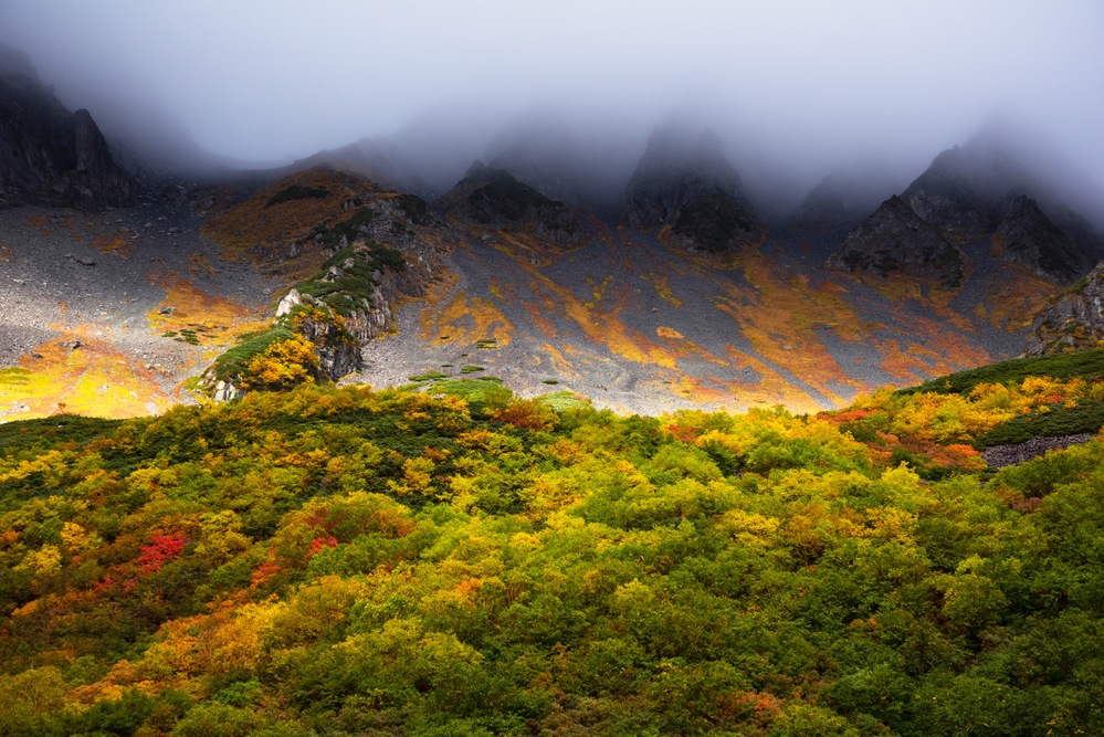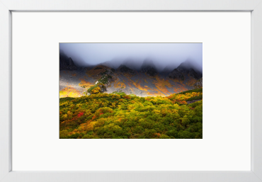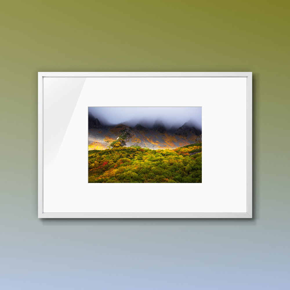 紅葉の高山植物を山肌に纏った穂高連峰の写真になります。自然が織りなす豪奢な色彩をお部屋に添えてみるのはいかがでしょうか。