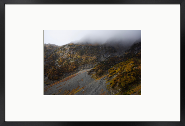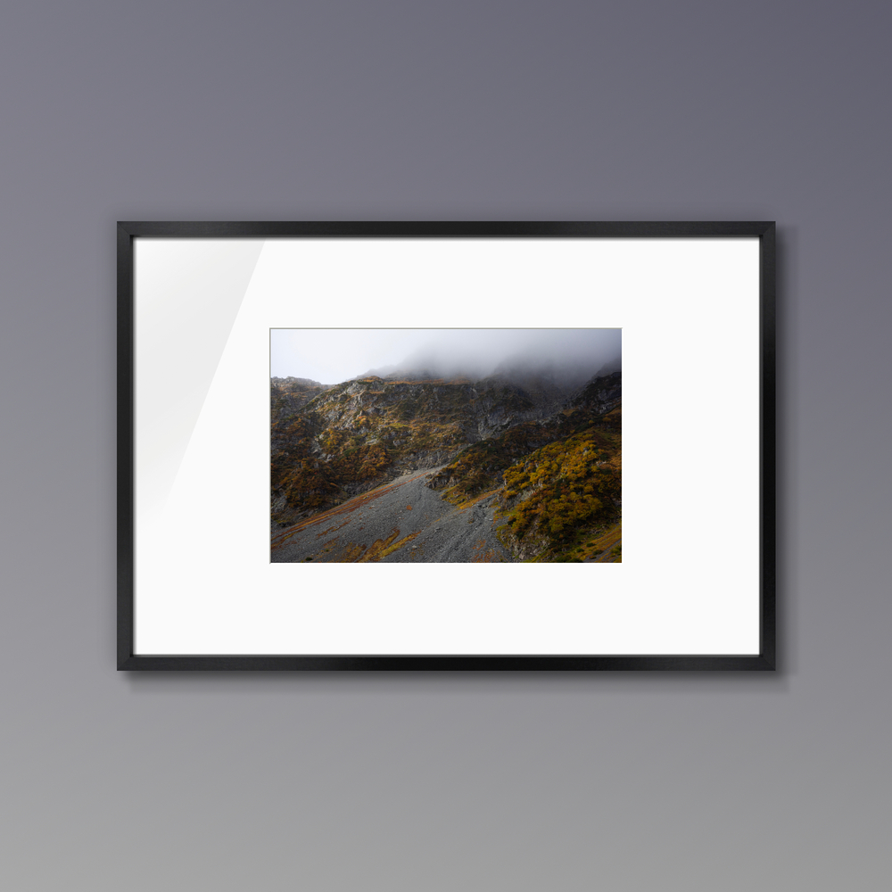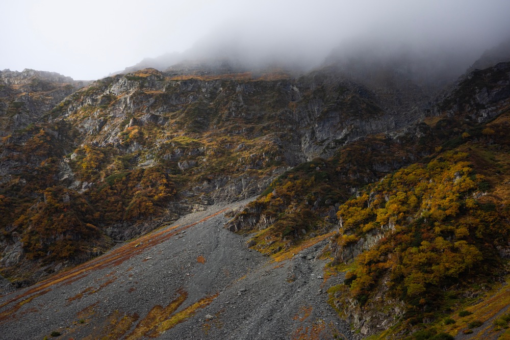 雲に包まれる穂高連峰の岩肌を捉えた一枚です。