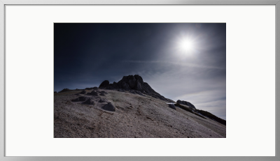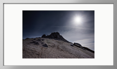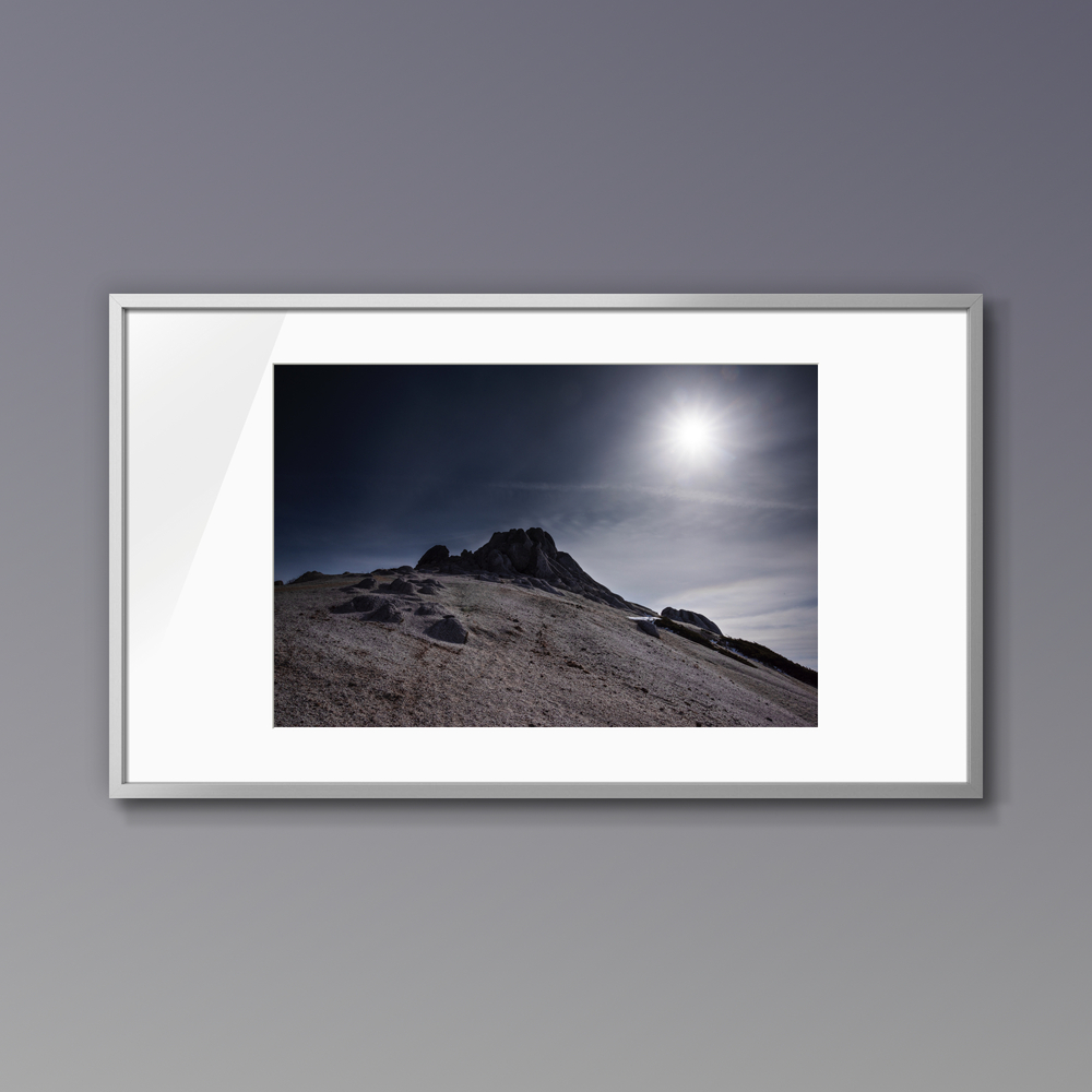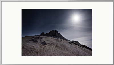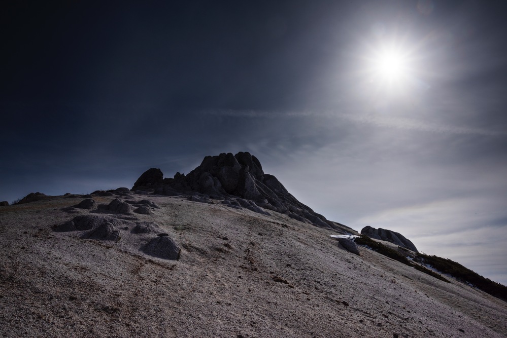 砂と岩石に覆われ荒涼とした稜線に日光が降り注ぐ午後。
