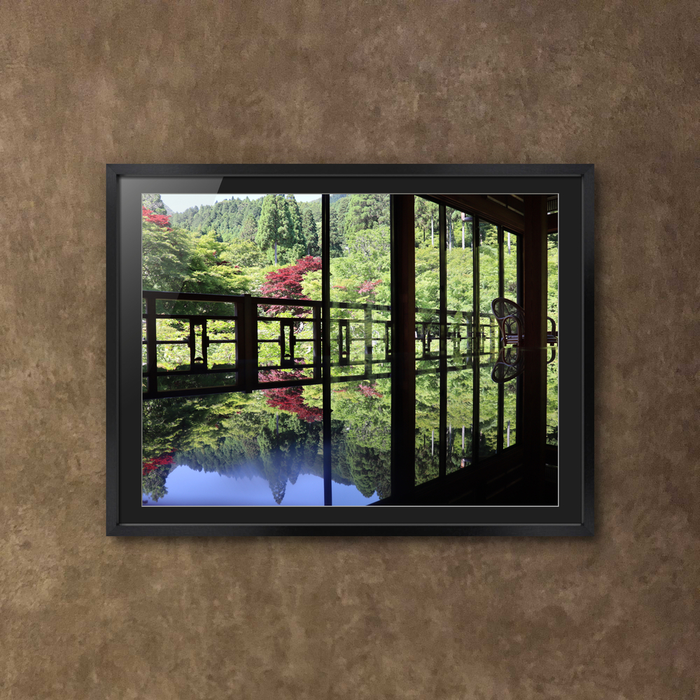 山荘「風遊山荘」2階の漆塗りテーブルに映り込む新緑と紅葉が、まるで鏡面世界のような幻想的リフレクションを生み出す——