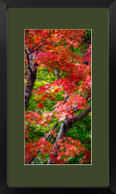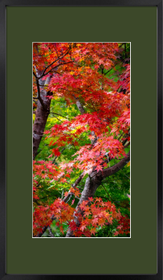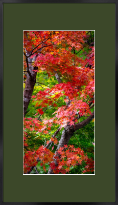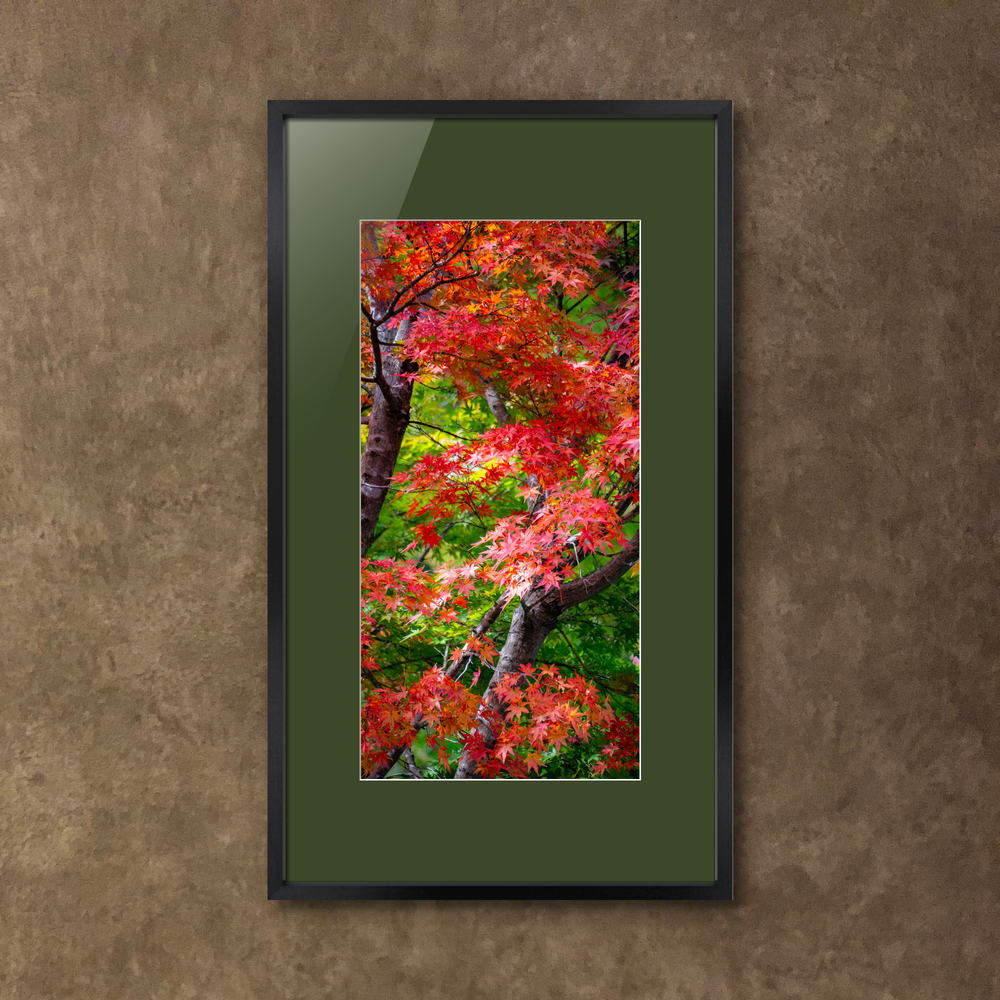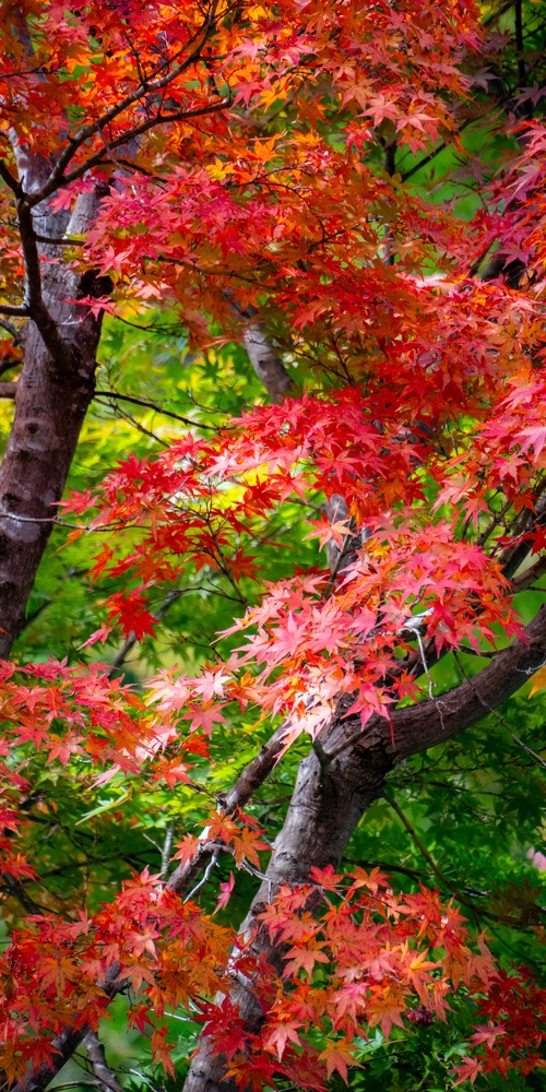紅に染まる季節のなかで、まだ若い緑がひっそりと佇む 季が重なるひとときに、移ろいの美しさが静かに息づく