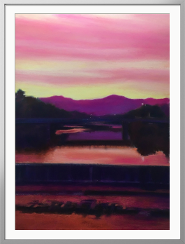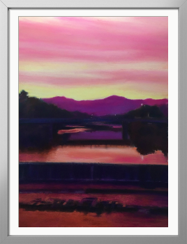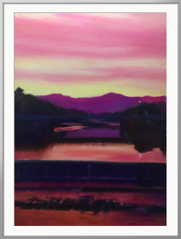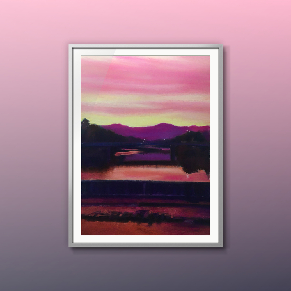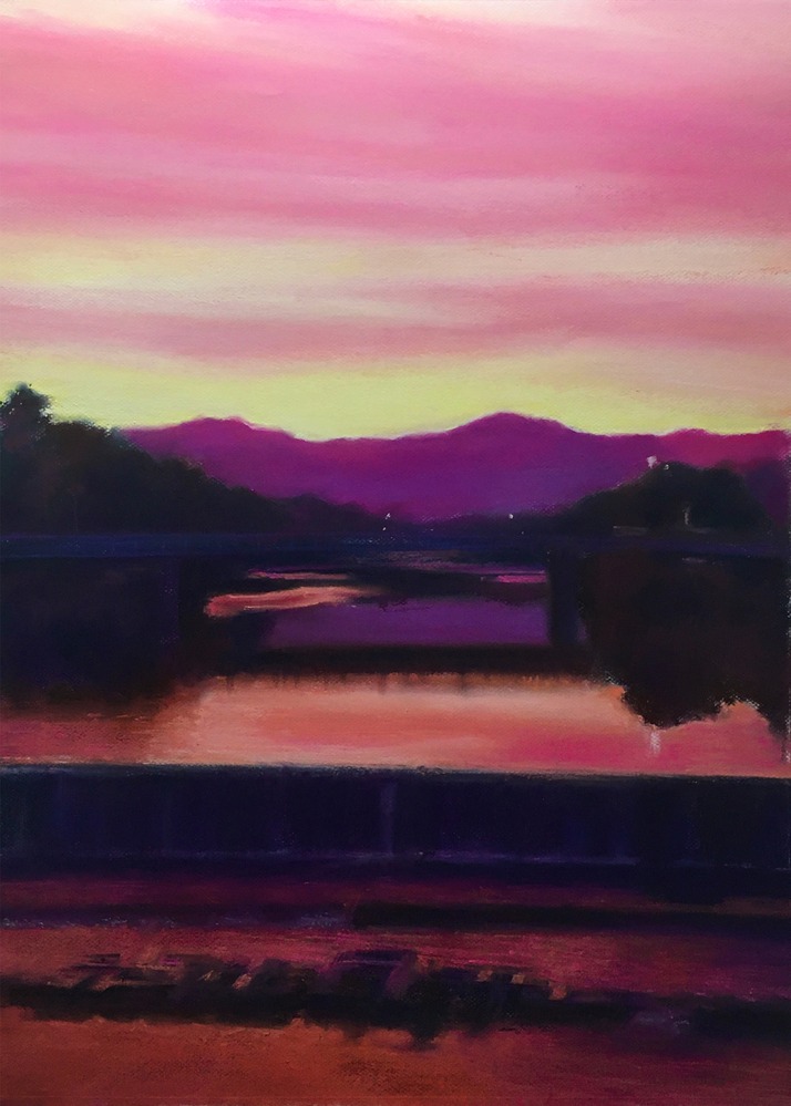 ある休日、友人と山に行って釣りをし、釣った魚とビールと一緒に食事をしながら色々な話をしてとても良い時間を過ごした。帰宅する途中の夕日は、穏やかで優しく、景色はオレンジピンクのフィルターがかかっていて川には波はなく、静かに夕焼け空が映り込んでいた。