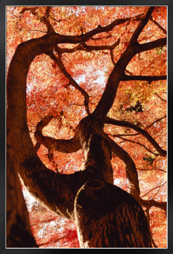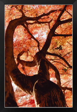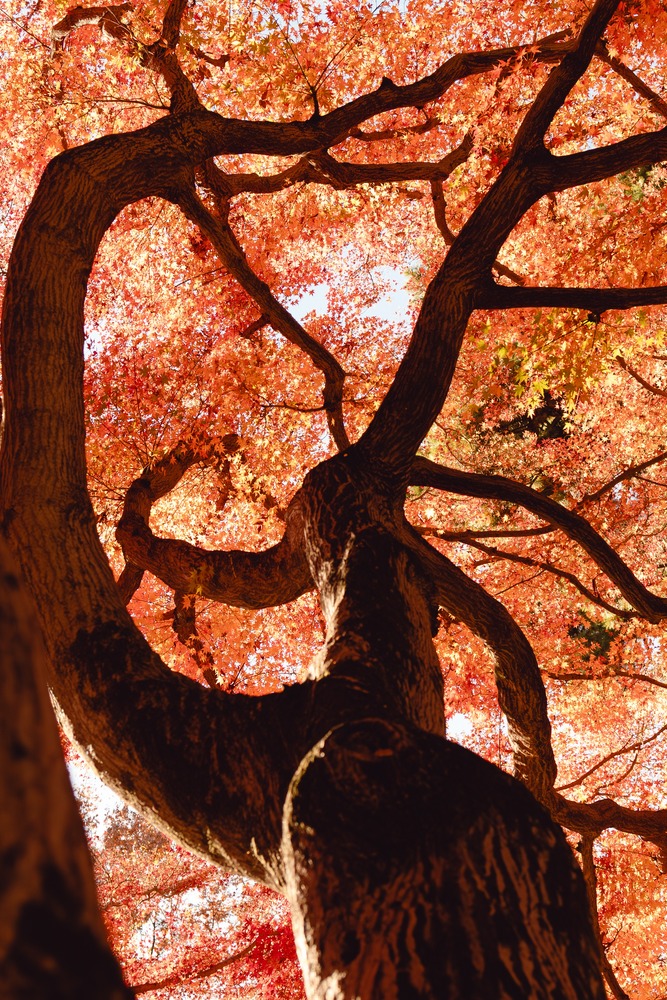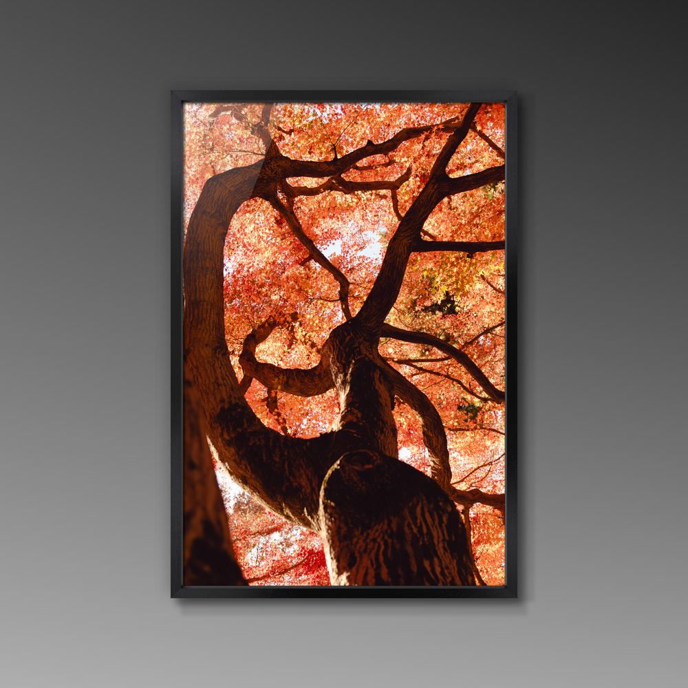天を覆い尽くすように枝を広げる、紅葉の巨木。 真下から見上げたその姿は、まるで大地から昇る炎の龍のようです。 圧倒的な生命力と、燃えるような色彩のエネルギーを、お部屋の主役に