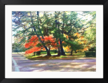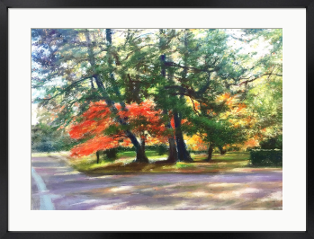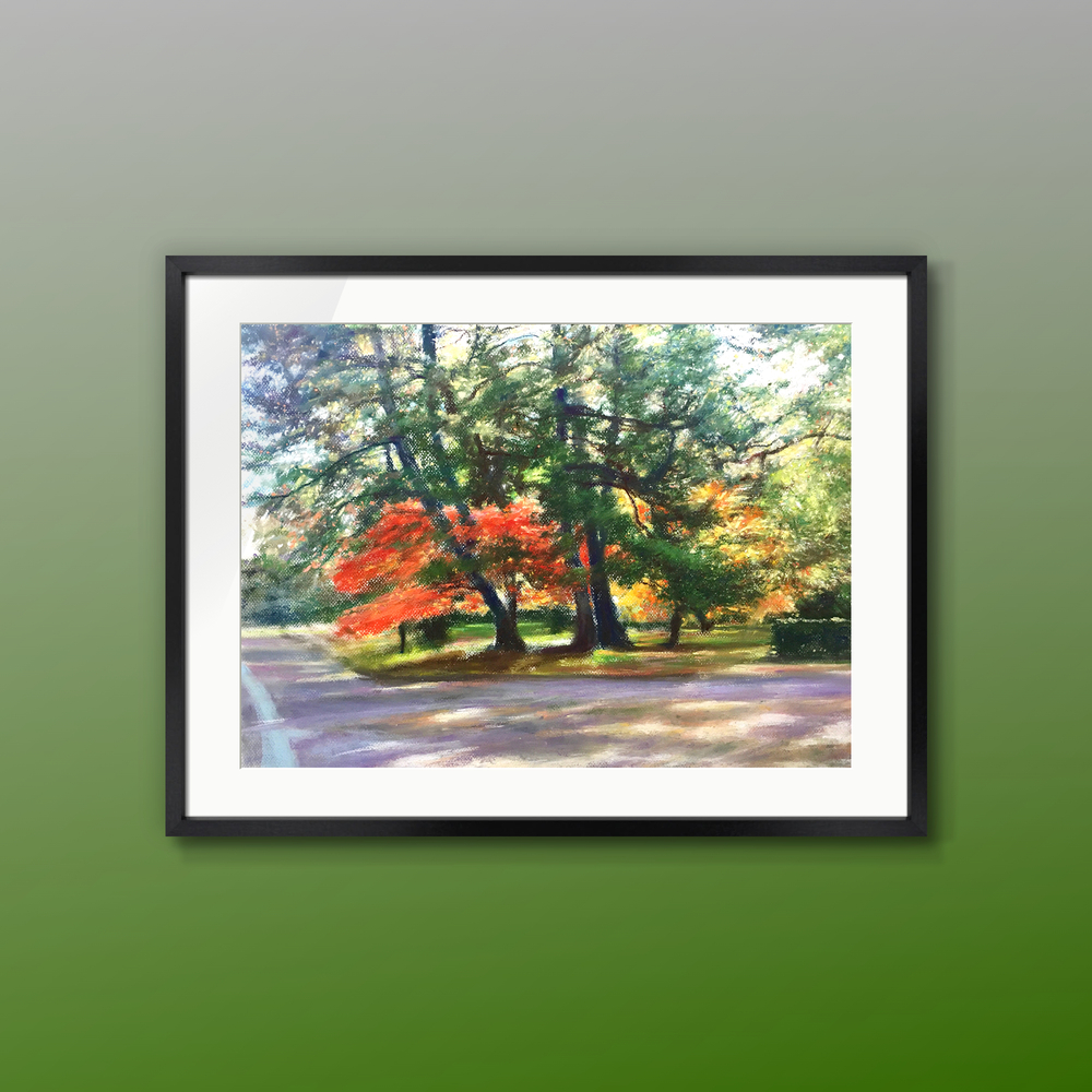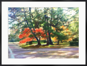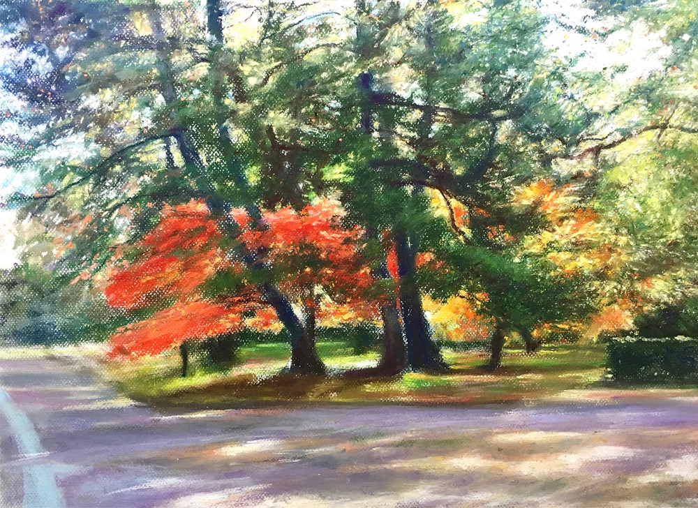 この作品は京都御苑内にある木々を描いた作品です。朝の光が紅葉と松の木から木漏れ、優しい空気が流れていました。