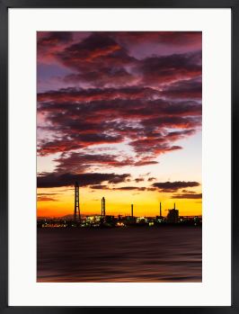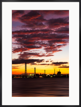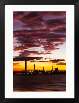 初夏の夕暮れ、空は濃厚な赤紫と橙色に染まり、工場のシルエットが力強く浮かび上がります。水面には空の色が映り込み、自然と人工物が織りなす風景が静かに広がります。煙突や塔の影は、都市の営みを象徴しながらも、どこか詩的な雰囲気を漂わせています。雲の表情は刻々と変化し、空全体が一つのキャンバスのように感じられます。この写真は、日常の中に潜む美しさと、季節の移ろいが生む一瞬の輝きを捉えた一枚です。初夏の空気に包まれながら、静けさと力強さが共存する風景が、見る者の心に深く残ります。