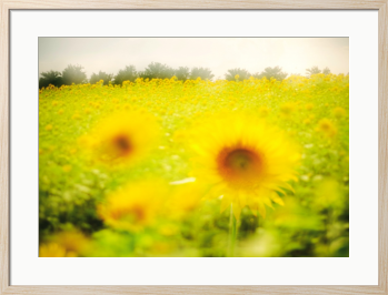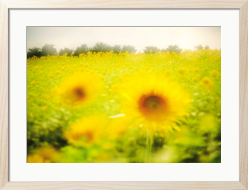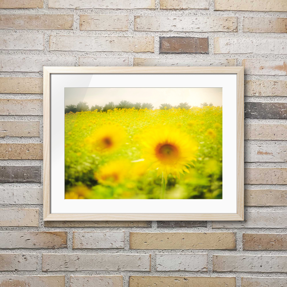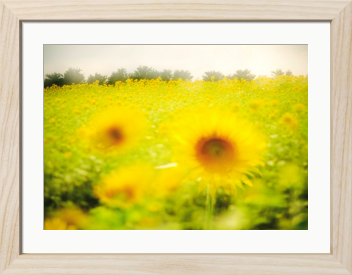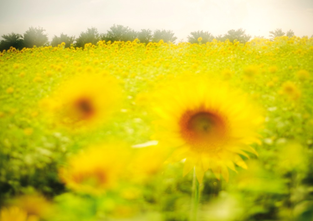 初夏の陽射しを浴びて咲き誇るひまわりたちが、広がる畑を鮮やかに彩ります。前景のぼかされた花々が柔らかな印象を与え、奥に続く黄色の絨毯が季節の豊かさを感じさせます。空は少し霞みがかっていて、光が全体を優しく包み込み、まるで夢の中にいるような雰囲気を醸し出しています。ひまわりの力強さと、写真全体に漂う穏やかさが絶妙に調和し、見る者の心を静かに満たしてくれます。自然の美しさと季節の移ろいを感じるこの一枚は、初夏の記憶として心に残る風景です。