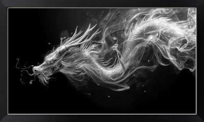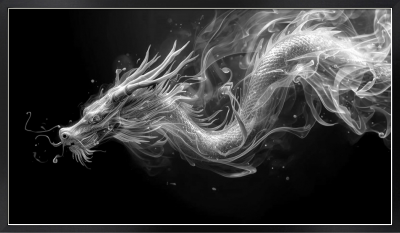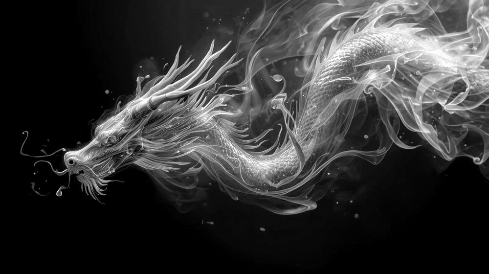 白い煙がゆらめきながら龍の姿へと昇華していく、幻想的な世界観を描いたデジタルアート作品です。