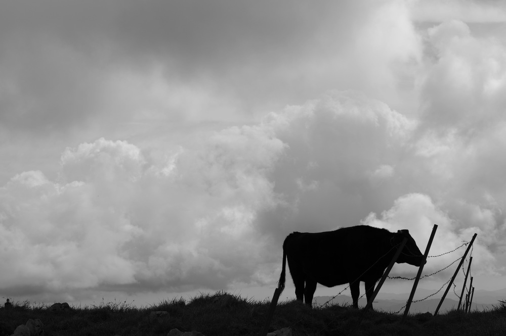 四国カルストの高原にて、雲が厚く広がる空の下、一頭の牛が静かに佇んでいます。モノクロで切り取られたこの風景は、色彩を排したことで自然の輪郭と空気感がより鮮明に浮かび上がり、見る者の心に深く染み渡ります。柵と牛のシルエットが、人と自然の境界を象徴するように立ち、広がる台地の静けさと力強さが同時に感じられます。四国カルスト特有の地形と空の表情が織りなすこの一枚は、日常から少し離れた場所で出会う「自然との対話」を写し取った、記憶に残る風景です。