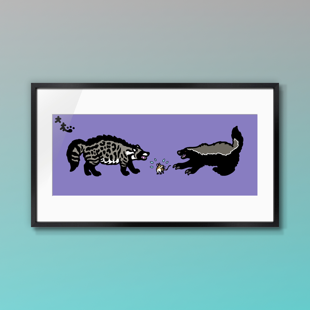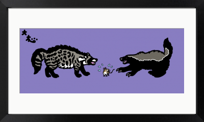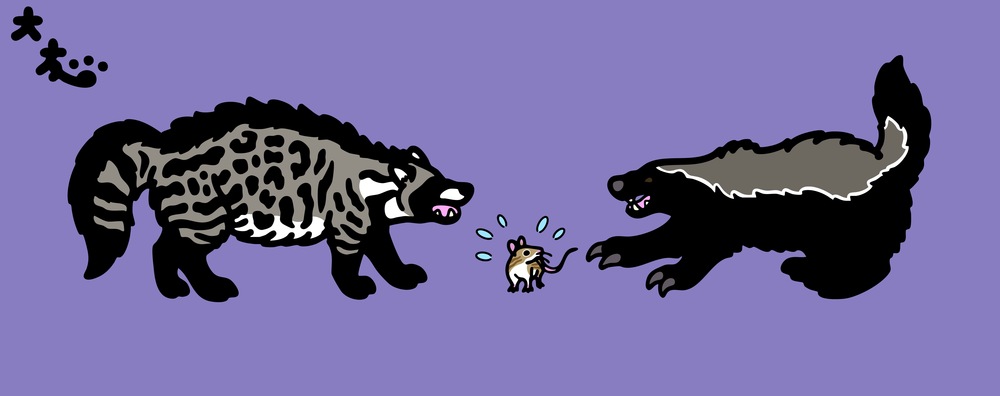分類:食肉目ジャコウネコ科/イタチ科(おまけが齧歯目ネズミ科) 英題:African Civet vs Honey Badger