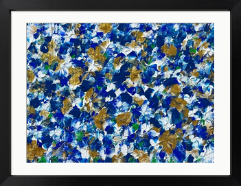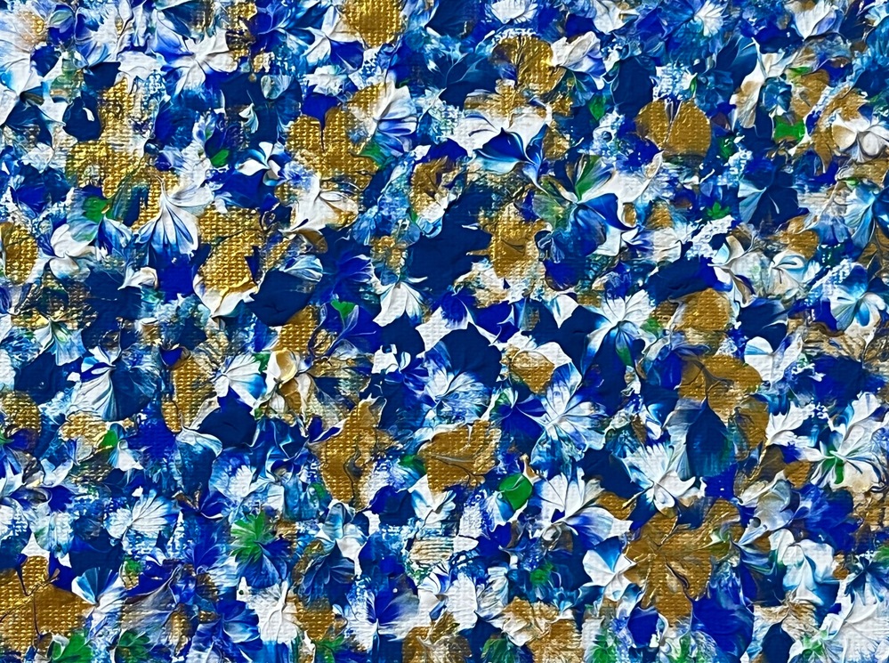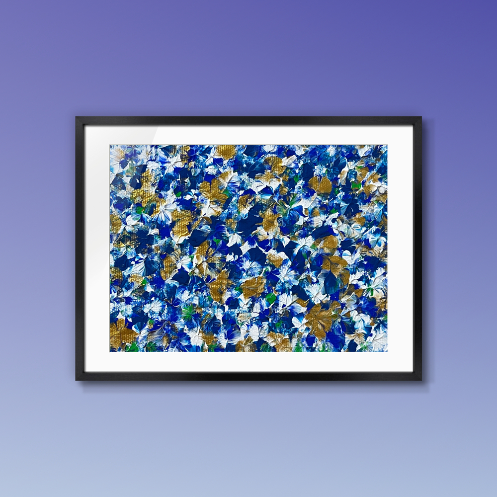 心を躍らせる神秘的な青色の花々が描かれた、魅惑の夜を感じさせる一枚です。サファイアのように深い青色が、まるで夜空の星々を思わせる美しさを湛えています。静けさに包まれたこのアートは、日常の喧騒を忘れさせ、心に深い安らぎをもたらします。見るたびに、その神秘的な世界に惹き込まれ、まるで夢の中にいるかのように魅了されてしまうことでしょう。