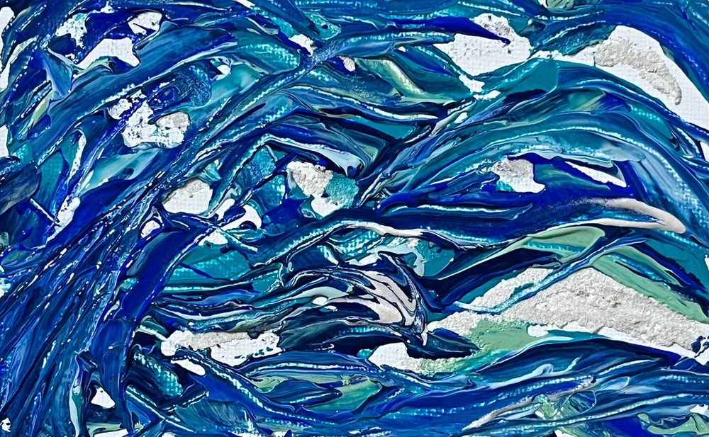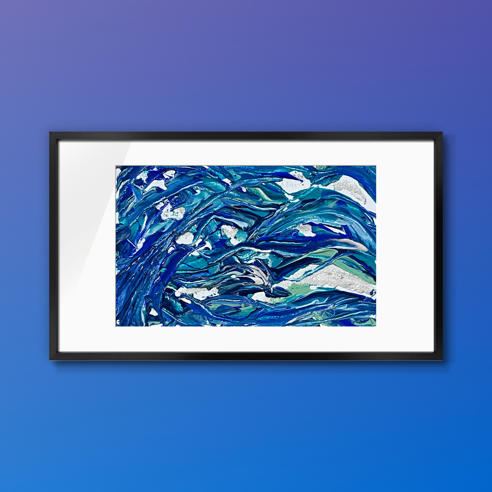 深い群青の波が優雅にうねり、銀の泡と淡いエメラルドが光を奏でる海の交響曲。 静かな深海から湧き上がる感情の流れを、流れるような筆致で描き出しています。 見るたびに心が洗われるような、女性らしい繊細さと力強さを併せ持つ作品。 小さなキャンバスに、無限の海を閉じ込めました。