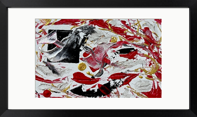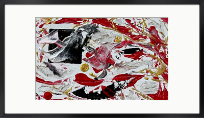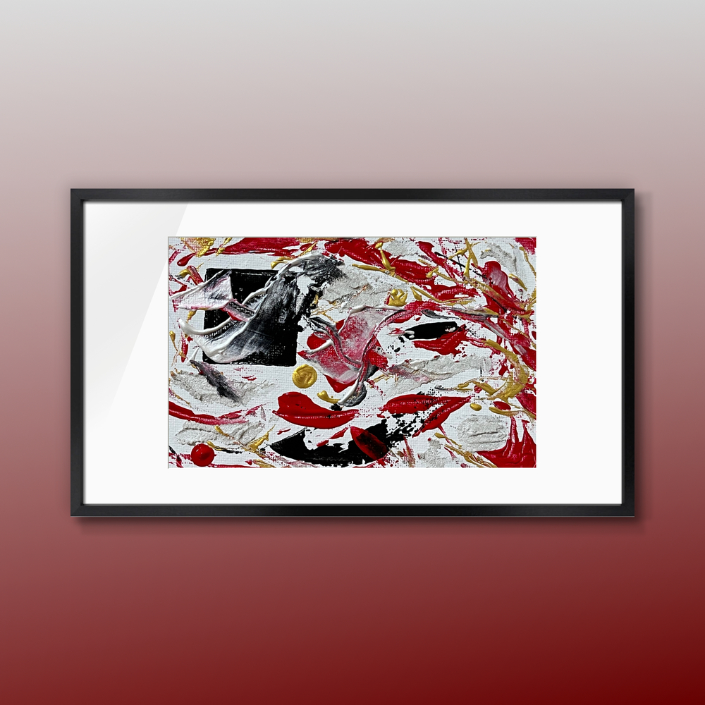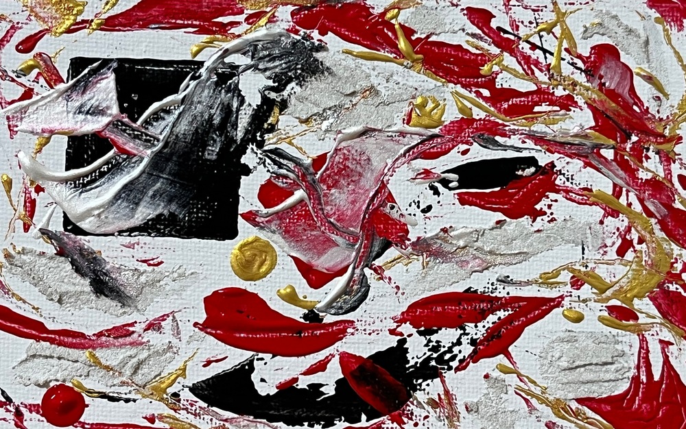 燃えるような紅と漆黒が絡み合い、金の滴が情熱の渦を舞う官能的な一枚です。 まるで禁断の恋が爆発した瞬間を閉じ込めたような、危険なほどに美しい抽象表現。 女性の内に秘めた激情が形になった、ドラマチックで魅惑的な作品です。
