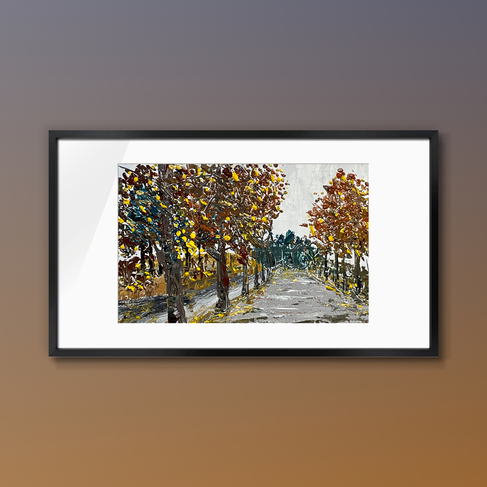 艶やかな琥珀色の秋の風景が織り成す、心を惹きつける美しい作品です。豊かな色彩が大地を包み込み、まるで秋の散歩道を歩いているかのような穏やかな感覚が広がります。日常の喧騒を忘れ、心に安らぎをもたらす瞬間へと導いてくれることでしょう。何度も鑑賞することで、心の奥に秘めた思い出や夢を思い出させてくれる存在となり、特別な空間を演出します。