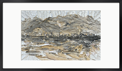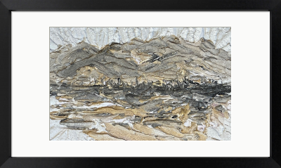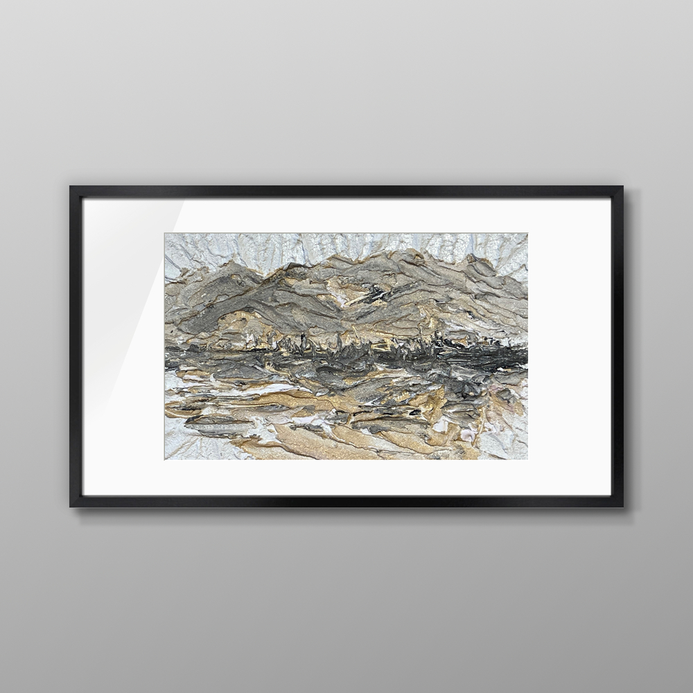 灰色の峰々が金色の霧に溶けゆく、静謐なる山脈の記憶。テクスチャの層が語る大地の息吹は、時の流れに抗う不変の詩情を湛え、魂の安らぎを誘います。心の中に秘めた思いや、大切な瞬間を再認識させる存在となり、特別な空間を演出する一枚となることでしょう。