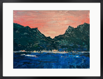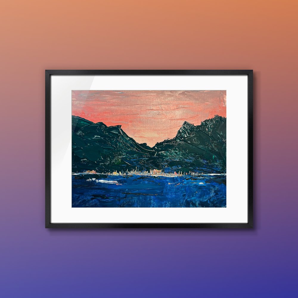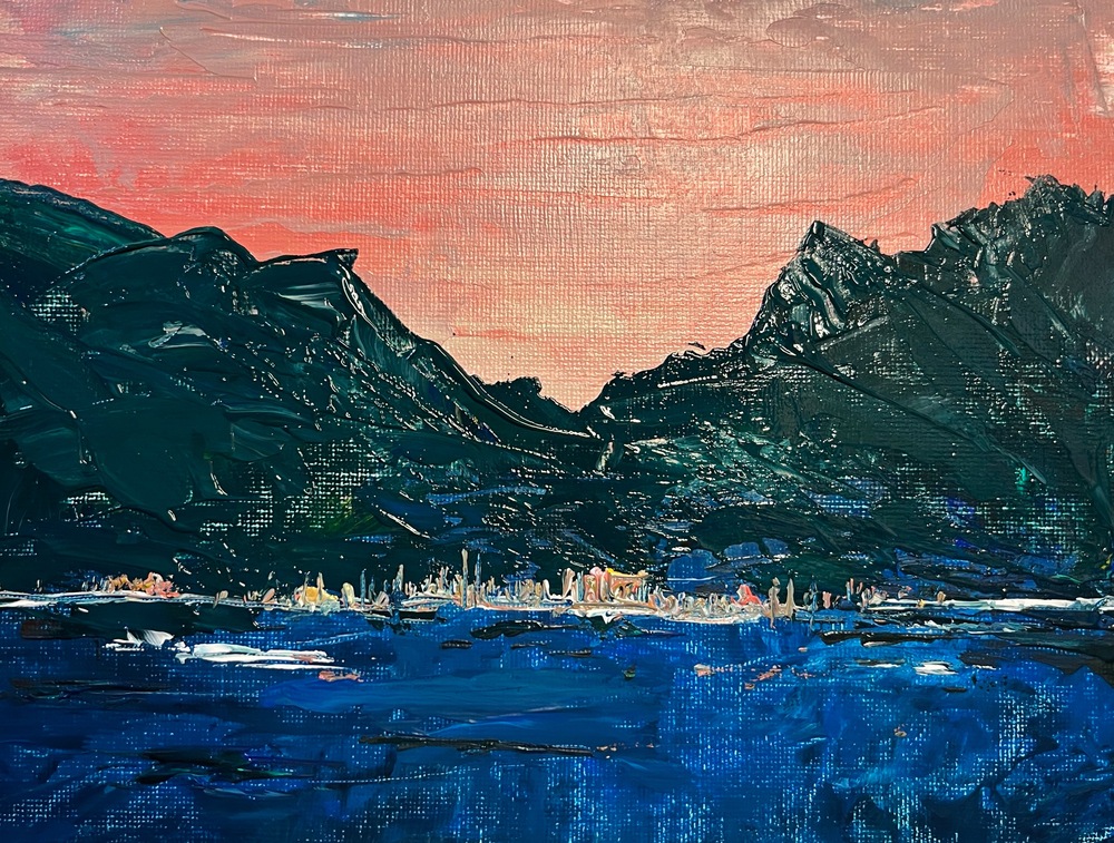 靄に包まれた緋色の地平線。紺碧の虚空から湧き立つ翠の峰が、淡桃の光に溶けゆくこの抽象は、夜明けのヴェールに潜む永遠の狭間を描きました。時間の層が重なり合う中で、静かな鼓動が色を震わせ、心の風景を優しく覆います。美しく絡み合う色彩が、あなたの空間に独自の物語を紡ぎ出し、静寂の中に潜む美を再発見させます。