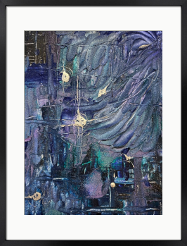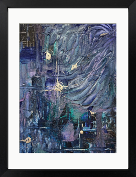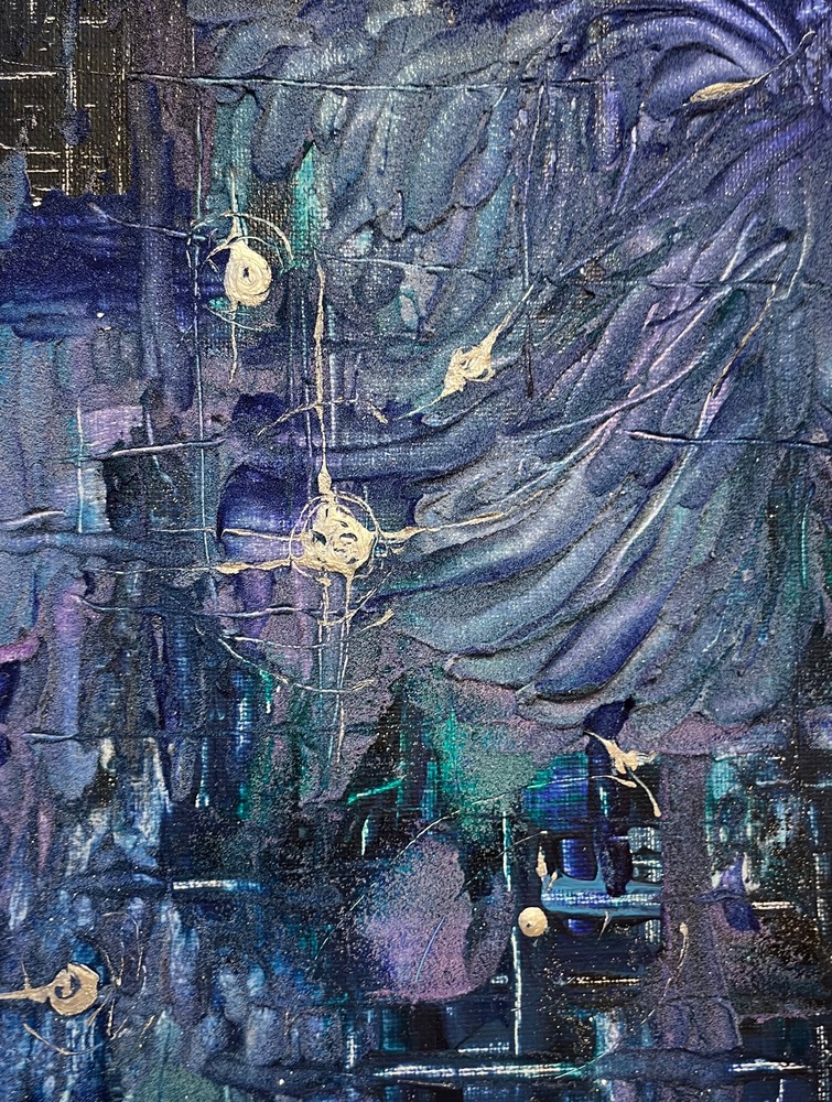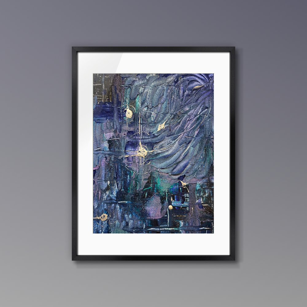 深いインディゴの渦が織り成す、心を引き込む美しい作品です。神秘的な色合いの中に、無限の可能性が広がり、まるで未知の世界へと誘われるかのようなワクワク感が漂います。日常の喧騒を忘れ、心をリフレッシュさせる瞬間へと導いてくれることでしょう。何度も鑑賞することで、心の奥底に潜む想いや願いを再認識させる存在となり、特別な空間を演出します。