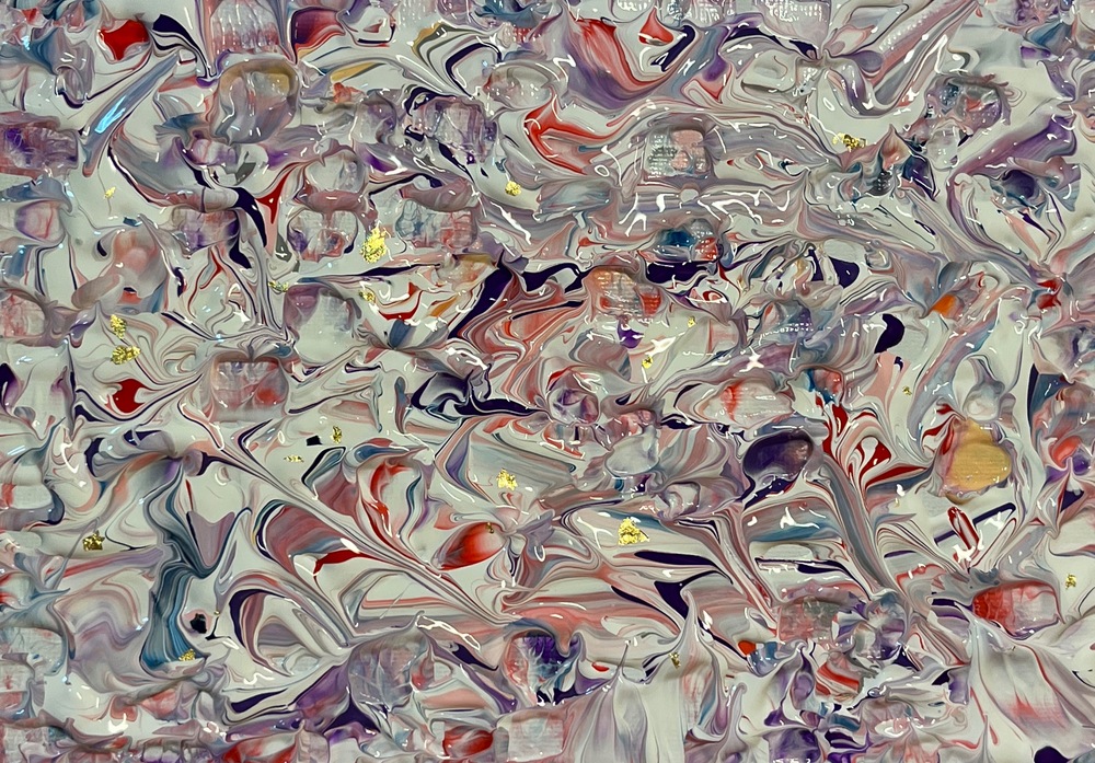 艶やかな大理石模様が織り成す、心を魅了する美しい作品です。多彩な色彩が調和し、まるで幻想的なオーロラを見上げているかのような感覚が広がります。日常の喧騒を忘れ、心に安らぎをもたらす瞬間へと導いてくれることでしょう。何度も眺めることで、心の奥に秘めた思い出や感動が呼び覚まされ、特別な空間を演出します。