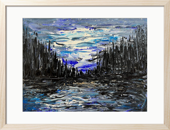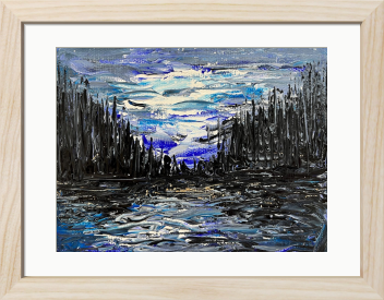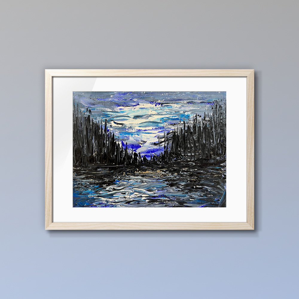 凍てついた湖面に映る満天の星と、黒い針葉樹のシルエット。 深い藍の空から降る光が、水面に銀の波紋を描き、息を殺して見つめたくなる静寂を湛えています。 北国の極寒の夜にだけ見える、神秘的で清らかな美しさを切り取った作品です。 心の奥に眠る静けさを呼び起こすアートをお楽しみください。