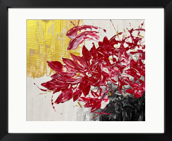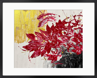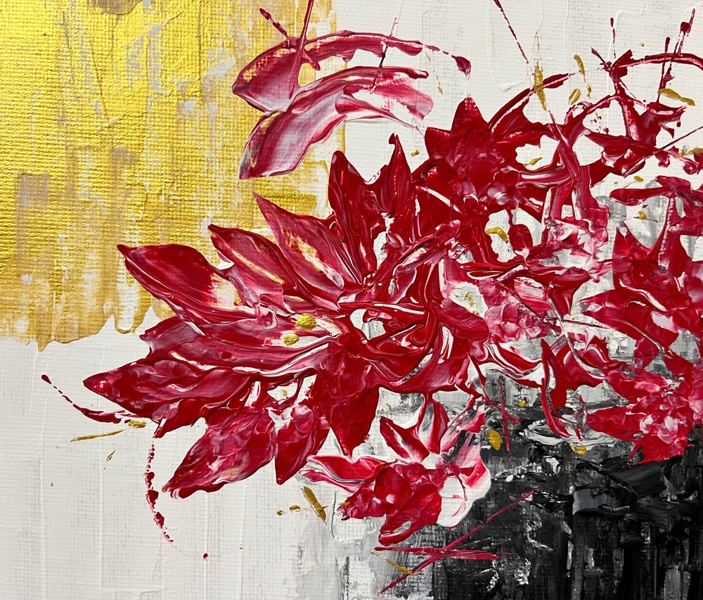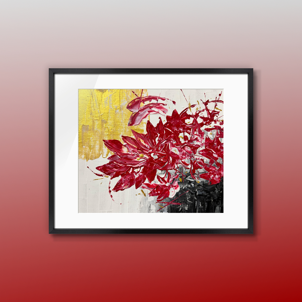 黄金の光を浴びて咲き誇る、深紅の花。 尖った花びらが闇と輝きの間合いで咲き誇り、その存在感が強烈な印象を残します。 この作品は、見るたびに新しい発見をもたらし、あなたの空間に神秘的なエネルギーを注ぎ込んでくれます。