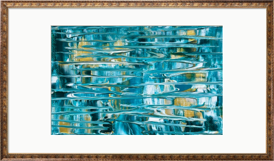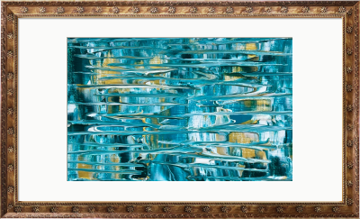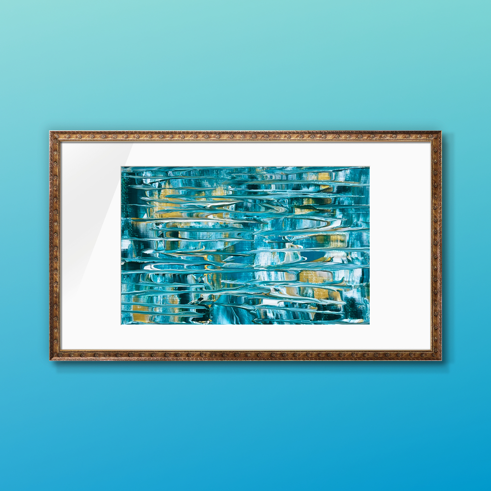 柔らかなターコイズブルーの層に、金色の光が優しく透けるアクリル抽象画です。海の深みから差し込む陽光のように、穏やかで希望に満ちた輝きが広がります。心に静かな癒やしを演出する、詩情あふれる一枚です。
