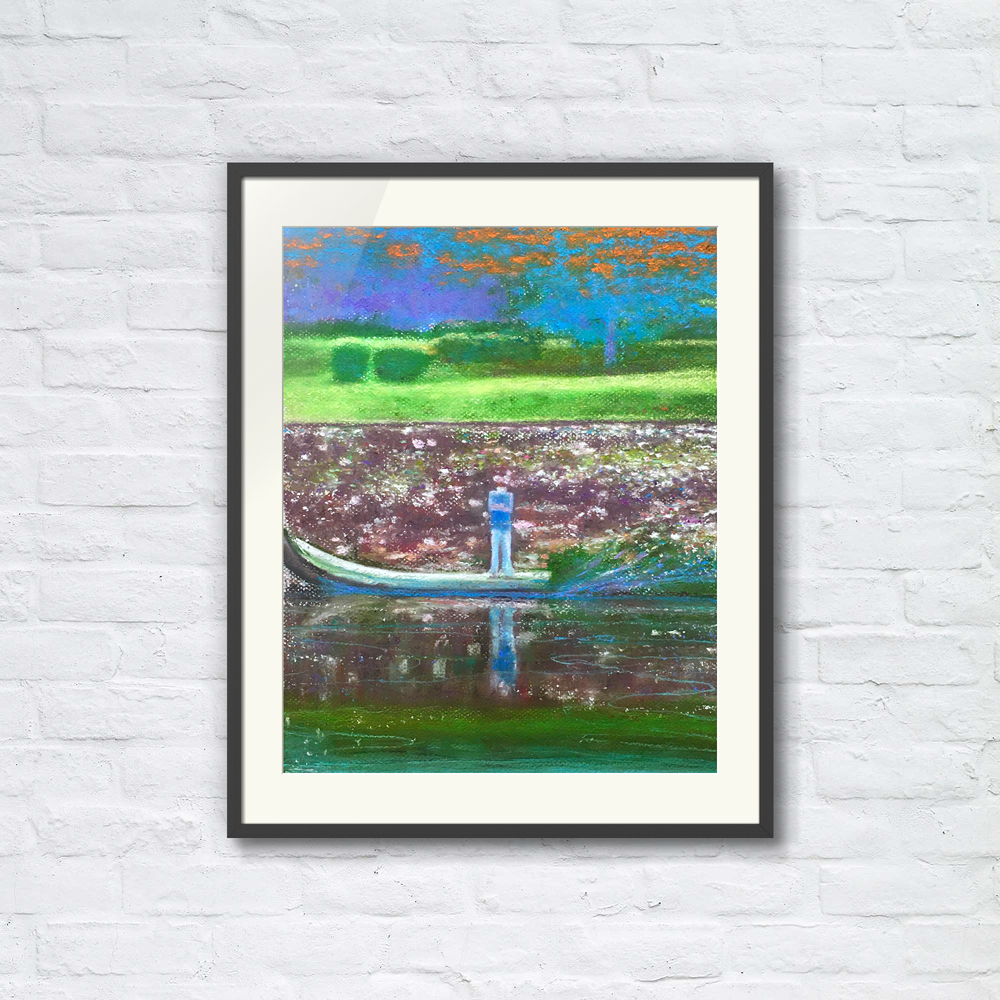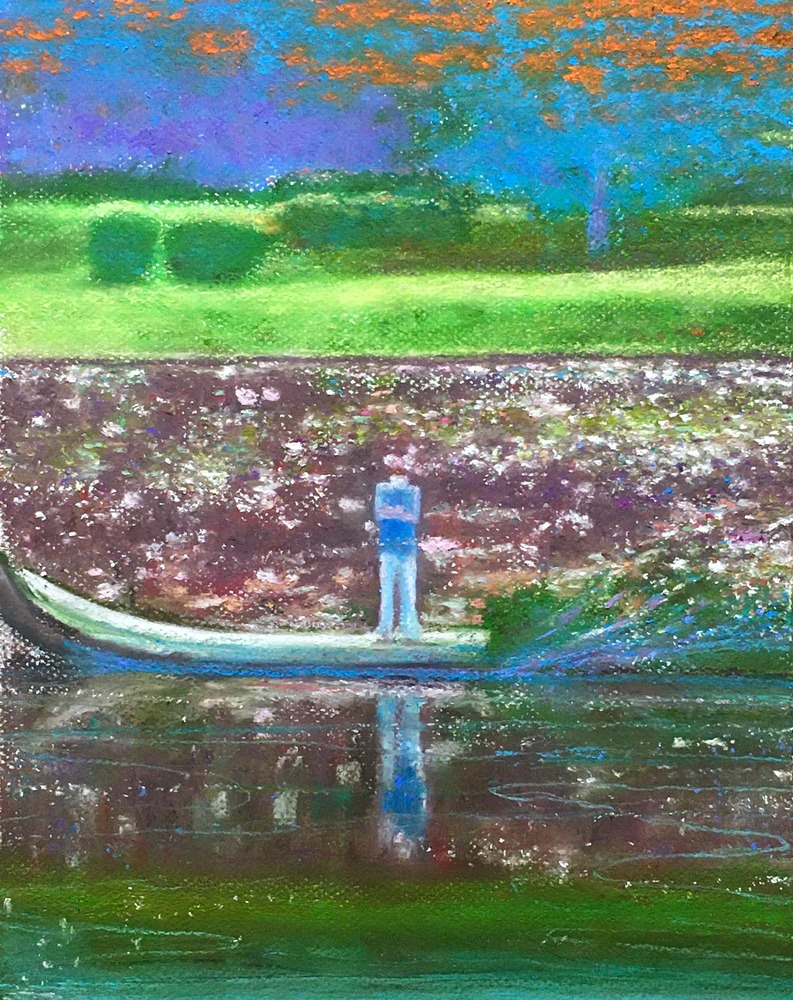 この作品は、コロナ禍に描いた作品です。 今までにしていなかったマスクをし、何を思うのであろうか?人々の生活は確実に変化しました。いつものように護岸に向かう。何を思うのであろうか?未来はどのように変化し進んで行くのか?そんな不安を抱きながらも日々の生活は進んでいく… 私たちも前へ進まなければなりません。