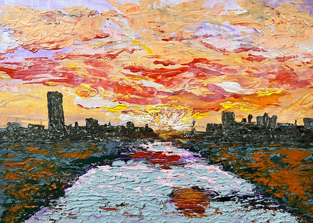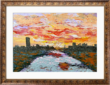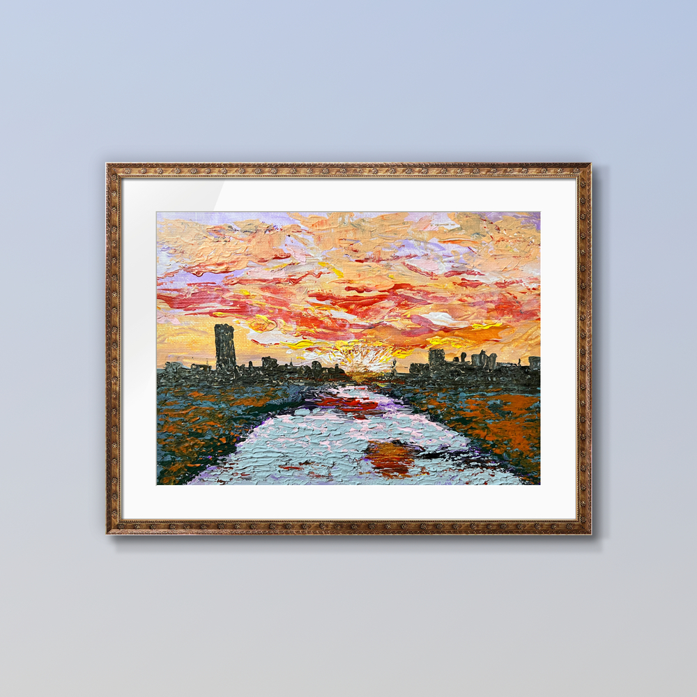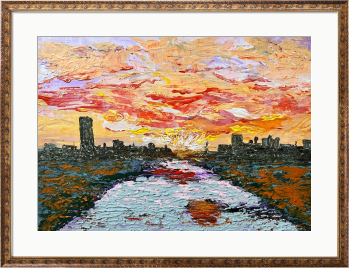 心を穏やかに包み込む、夕暮れの情景がここに広がります。橋の上から眺めた穏やかな夕陽が土手に揺れる草木や穏やかな川の流れに映る様をアクリル画で抽象的に表現しました。燃えるように沈む太陽が水面を優しく染め上げ、遠くに浮かぶ街並みの柔らかなシルエットが心に静けさをもたらし、空間に癒しのひとときを提供します。