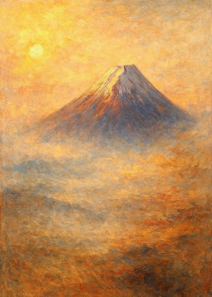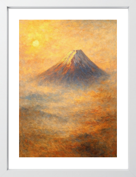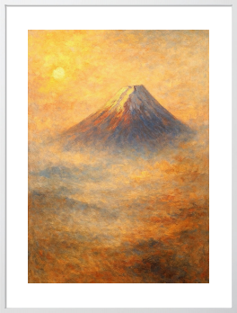 AIで元を生成し、Photoshop等を使用して制作したデジタルアート作品です。 富士山と風の気配として立ち上がる、 日常の空間に、呼吸するような作品です。