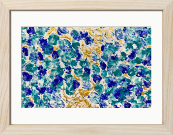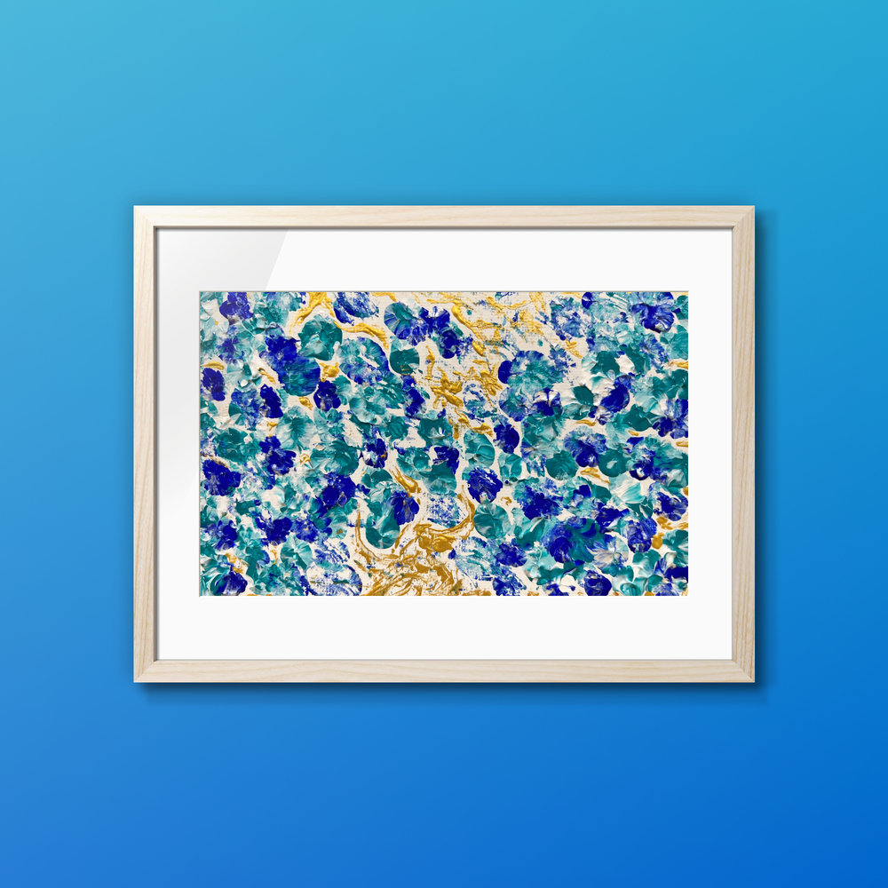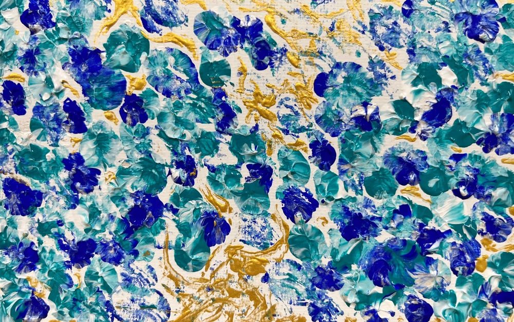 ターコイズ・ブルーの花々が金の輝きを浴びて優しく咲き乱れます。爽やかなブルーのグラデーションの花々が、女性らしい喜びと優雅さを静かに語ります。