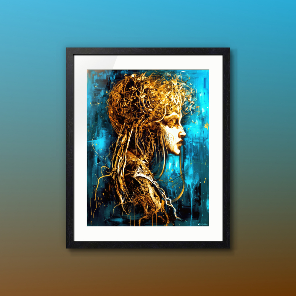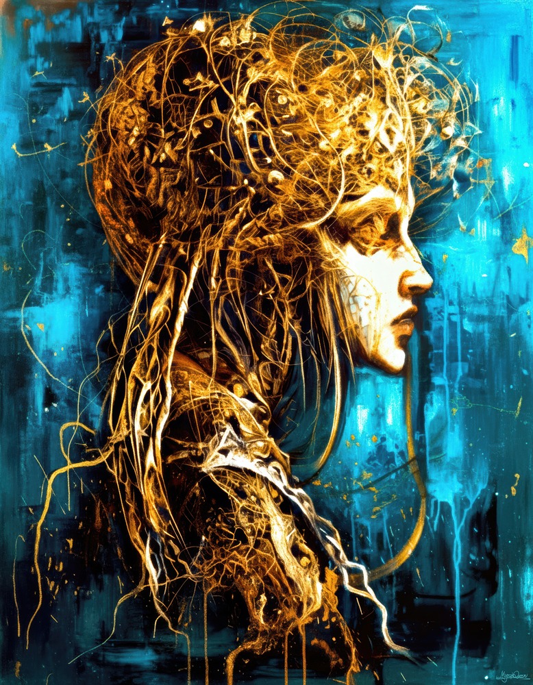 時は絡まり、過去と未来は境界を失う。 碧と黄金が交錯する画面の中で、静かに語られるのは「避けられぬ運命」ではなく、 それを見つめ、受け取る人間の内なる意識である。 この作品は、予言や神秘を外側の物語として描くのではなく、 観る者自身の深層に眠る“時の感覚”を呼び覚ますための肖像画。 沈黙の中で、運命はすでに囁かれている。