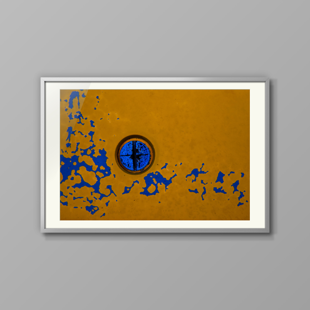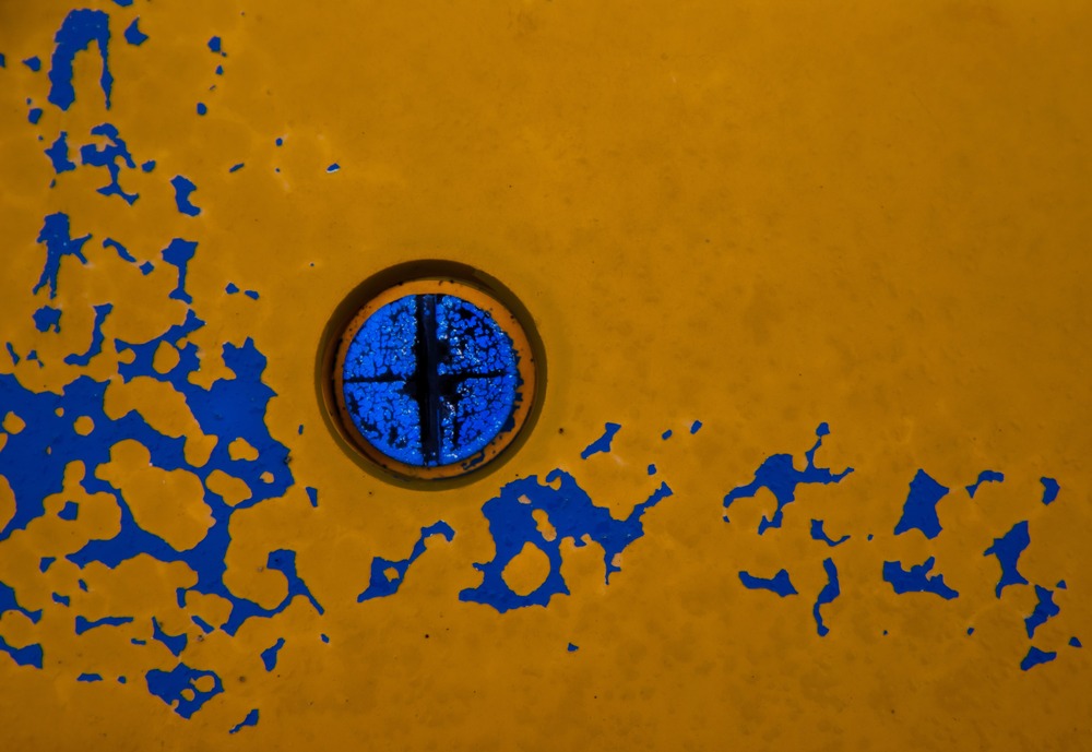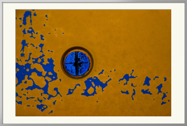 NY公募展2025秋冬 入選作品 ペンキ塗装された杭 ふ頭に、幾重に塗り重ねられた鉄の杭があり、愛されて使われているのが強く伝わってくる。 黄X青の補色、欠落面のリズム、左の円が拍を刻み、マチスのJazzとDanceの両方を連想した。 #青 #黄 #ペンキ #円 #リズム #剝離 #blue #yellow #circle #rhthm #jazz #dance #Matisse #paint