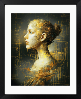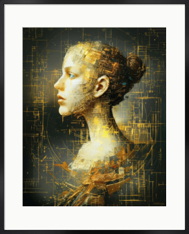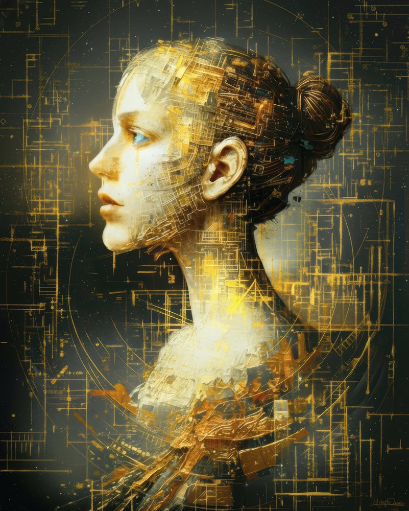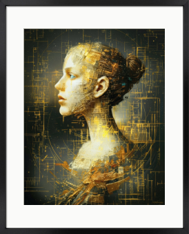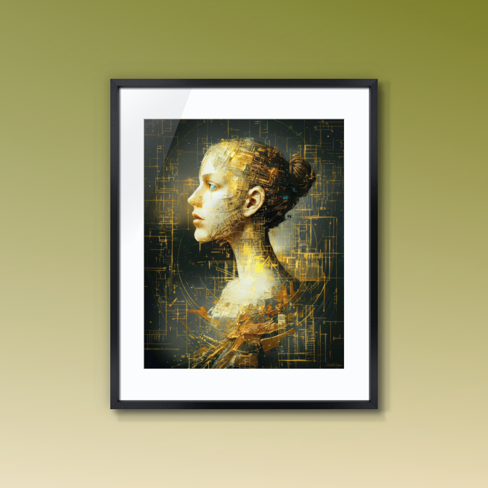 本作は人と情報、記憶と知性の境界に生まれる静かな肖像を描いている。 黄金の構造体は知の蓄積や時間の層を象徴し、 人物の表情は、未来と過去が交差する一瞬の内的状態を示している。 デジタルとアナログ、幻想と現実が重なり合うことで、 普遍的な美しさのかたちを探求した作品である。