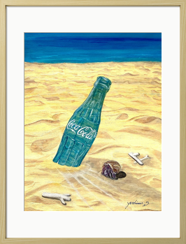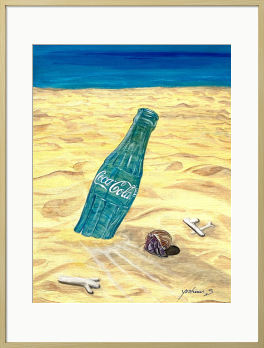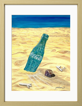 枝サンゴが混じる砂浜にコーラの瓶。その傍らにヤドカリがひとやすみ。人工物と自然のコラボレーションが生み出す景色。