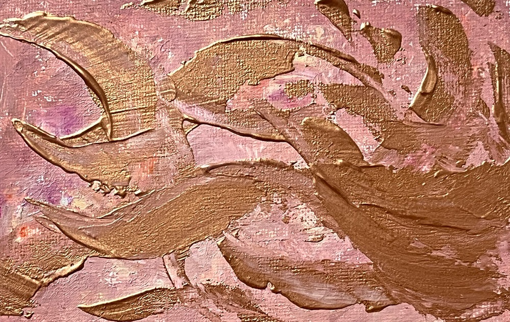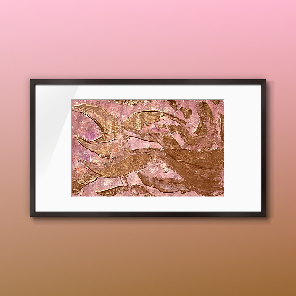 ローズピンクに舞うブロンズ色が生み出す優美さと温もりが、空間に華やかさをプラスします。シックなトーンの組み合わせが魅力的で、見る人の心を引きつける特別な一瞬を提供します。この美しいデザインは、優雅でありながらも落ち着きがあり、どんな空間にも調和し、心を豊かにする雰囲気を醸し出します。