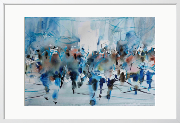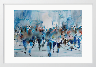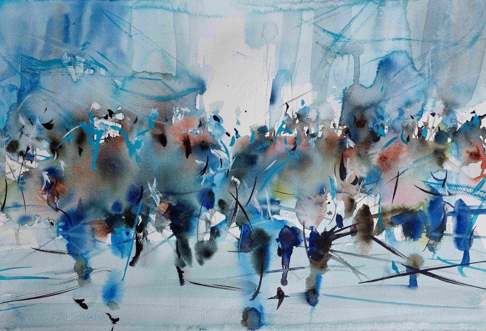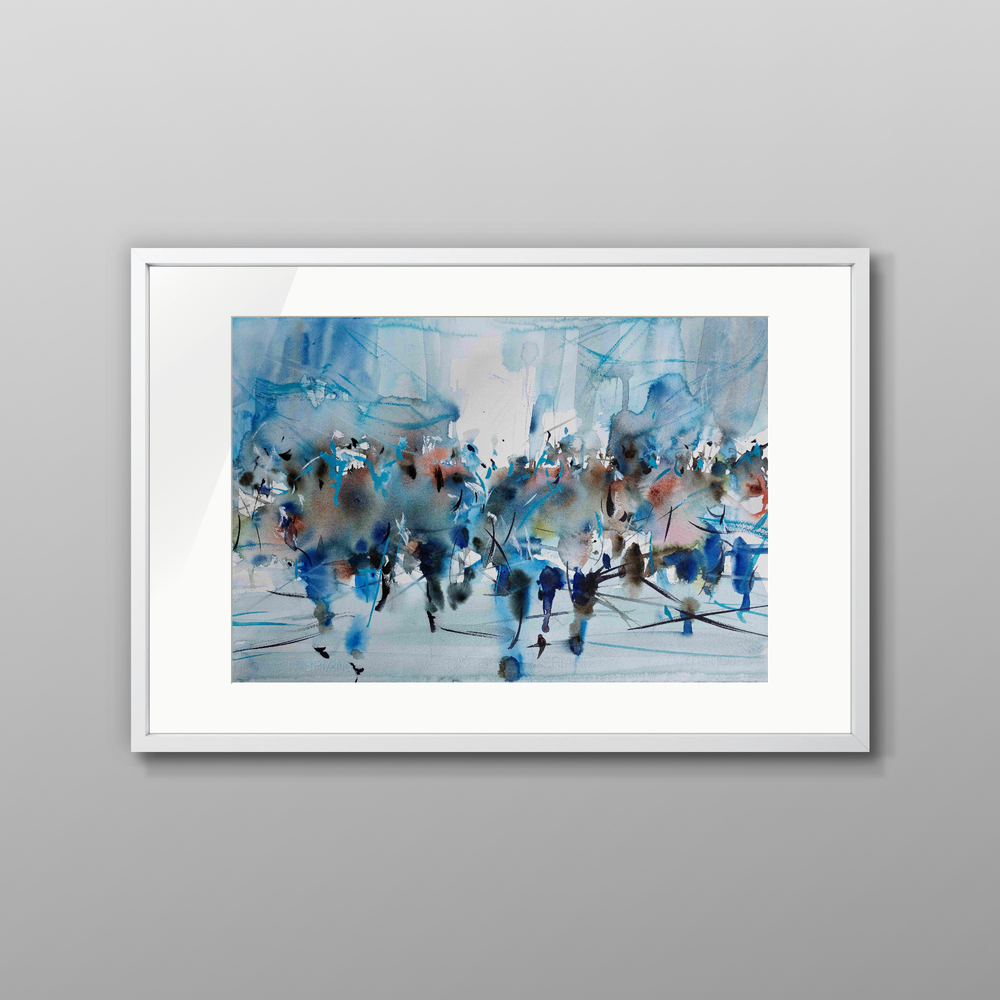 この作品は、都市を行き交う人々の気配や流れを、水彩ならではのにじみと線で表現したものです。画面を横切る青や灰色の重なりは、通勤や移動の途中ですれ違う無数の人の存在を思わせます。一人ひとりは目立たなくても、集まることで都市の空気やリズムを形づくっている――そんな日常の一場面を抽象的に描いています。