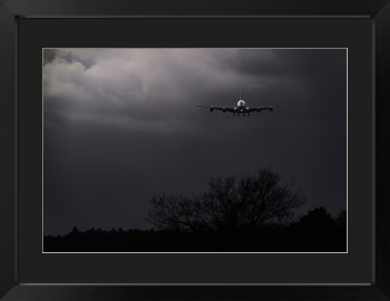 世界最大の旅客機であるA380が、その巨大な翼を広げてこちらへ向かってくる瞬間には、他では味わえない独特の緊張感と高揚感があります。背景の暗雲が描くドラマチックなグラデーションと、機体の金属質感が放つ鈍い光の対比は、見る者に畏怖の念さえ抱かせます。