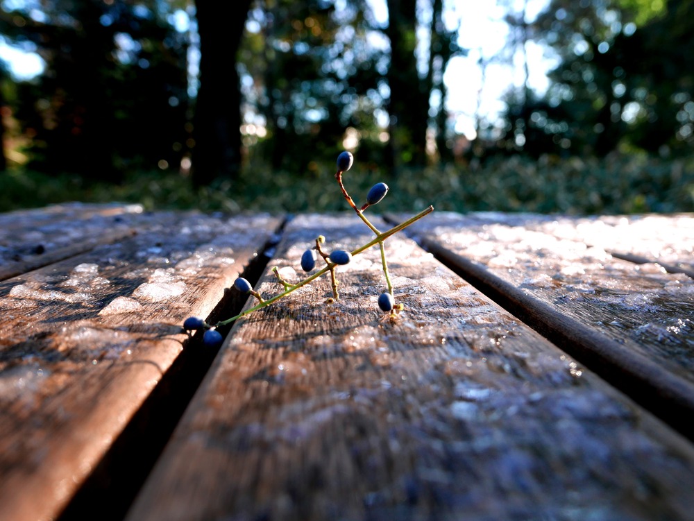 早朝の駒場公園 雪が残るテーブル 一筋の朝陽