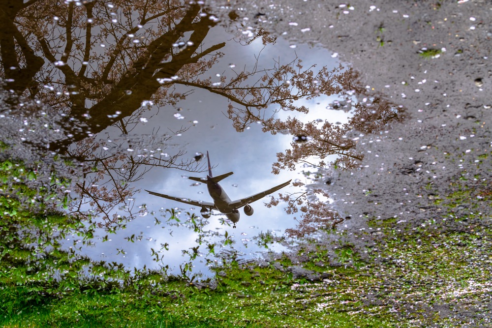 足元の小さな水たまりの中に広がる、もう一つの空。 雨上がりの静寂の中、水面に浮かぶ桜の花びらと、その上空を横切るボーイング777の姿をリフレクション(映り込み)で捉えた、幻想的な一枚です。