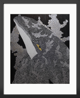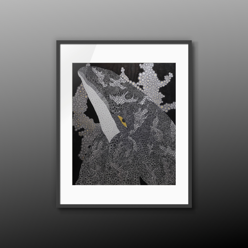 黒い背景の中に浮かび上がるのは、広大な海で生きる1頭の鯨。その大きな体と穏やかな様子から“包容”の象徴とされている。
