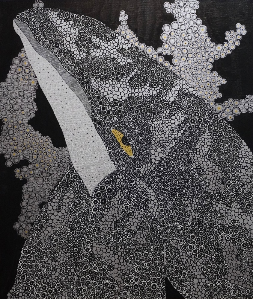 異質に見える歯車様の小さな円は、全身にエネルギーを供給する“細胞”を表している。ただの線や円だが、重ねて描くことで命が宿る。繊細かつ大胆に描くことで、目を近づけてみたくなる。そんな絵を目指した。
