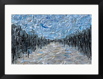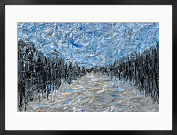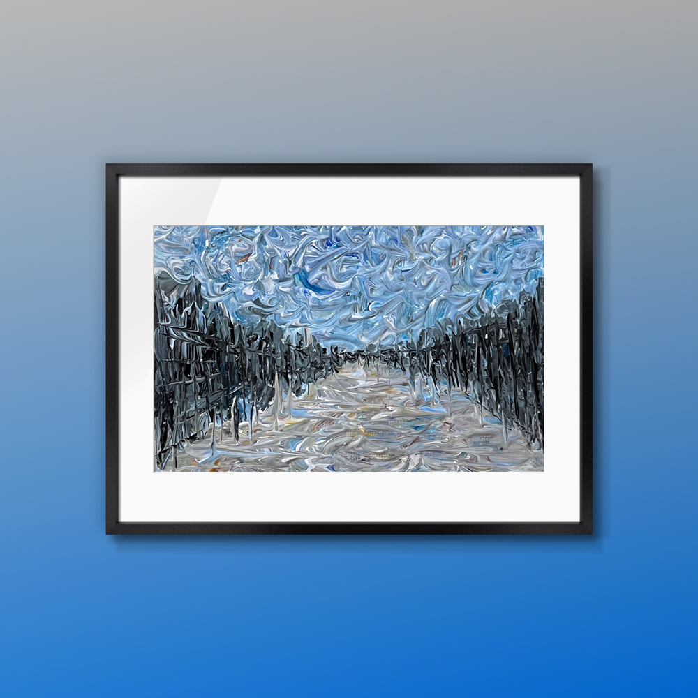 深い夜の幻想が漂う空の下、月明かりに照らされた朧な景色と静けさを融合させた作品です。重厚な青と銀の渦が織りなす世界は、どこか現実の境界を越えた静寂を湛え、心の奥底に潜む神秘的な美しさをそっと呼び起こします。リラックスしたいひとときや、心を穏やかに保ちたい瞬間にぴったりのアートです。