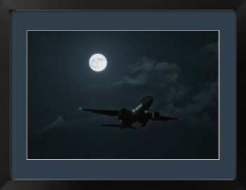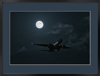 漆黒の空を背景に、月光を浴びて浮かび上がる重厚なシルエット。翼の先端で光るナビゲーションライトが、暗闇の中に確かな存在感を刻んでいます。着陸を目前に控えた機体の凛とした佇まいは、薄い雲を透かして届く月の柔らかな輝きに包まれ、まるで夢の中の光景のような気品を漂わせています。