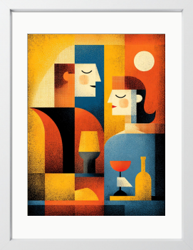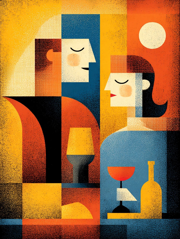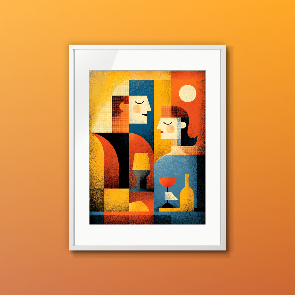 語らいの余韻を、琥珀色の光に閉じ込めて。 向き合う二人の静かな境界線を、洗練された幾何学模様で表現しました。プライベートラウンジやダイニングに、親密で知的な温度感をもたらす一枚です。
