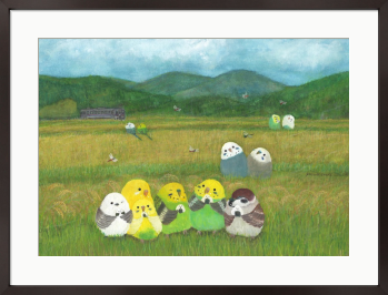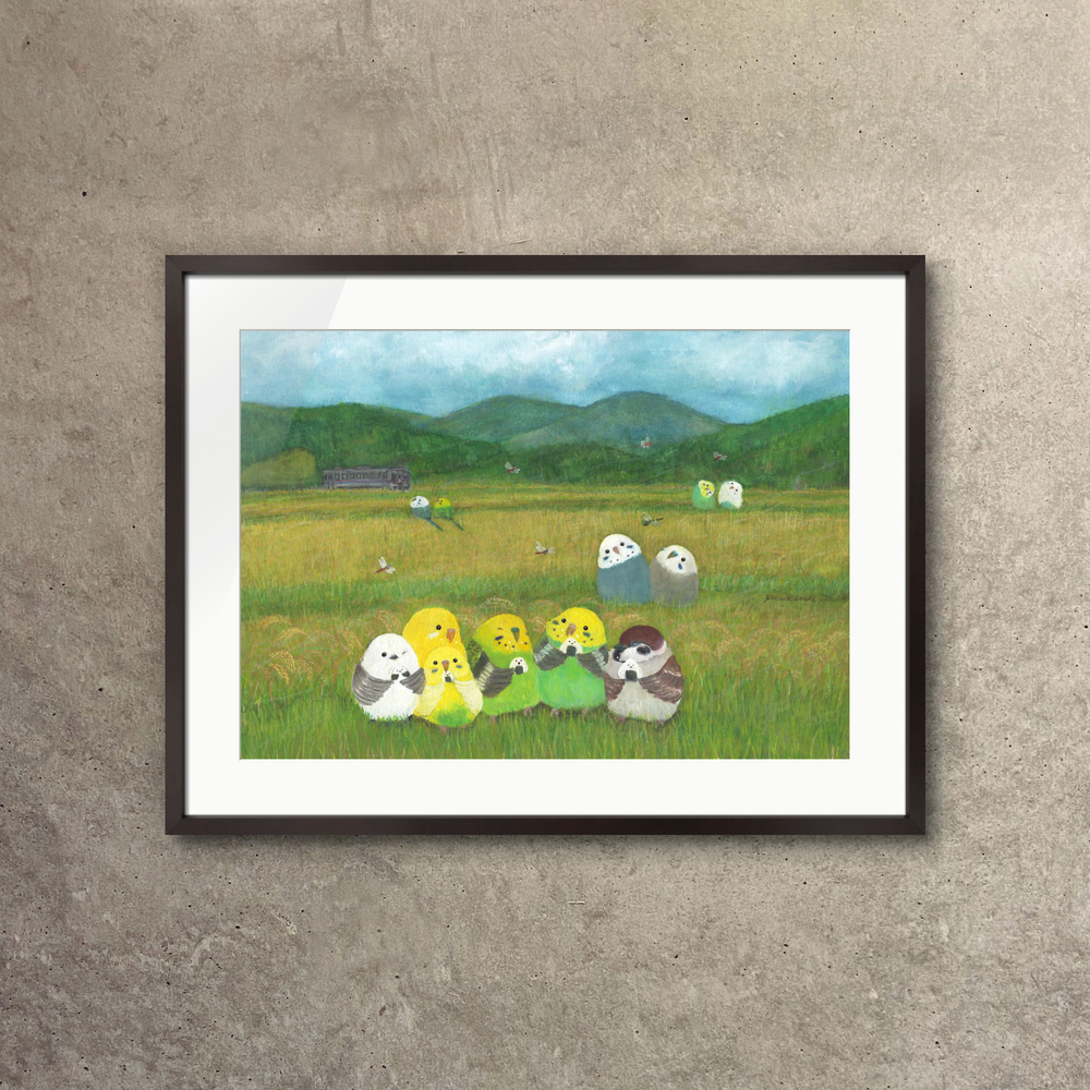 おにぎりインコ 日本人のパワーフード『おにぎり』 背景には秋の田園風景と電車、山々、赤トンボ、オニヤンマなど心和む一点もの絵画です。 原画ならではの質感、色彩、煌めき、温かさをお楽しみいただけます。 もしも…鳥たちの世界があったなら……。 自由に物語を想像していただけましたら幸いです。 お部屋に飾るインテリアアートとしてもおすすめの1枚です。