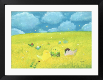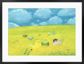 花畑と小鳥たちを描いたイエローが綺麗なインテリアアートとしてもおすすめの絵画です。 小鳥達を優しいタッチで描きました。 もしも…鳥たちの世界があったなら……。 自由に物語を想像していただけましたら幸いです。 お部屋に飾るインテリアアートとしてもおすすめの1枚です。