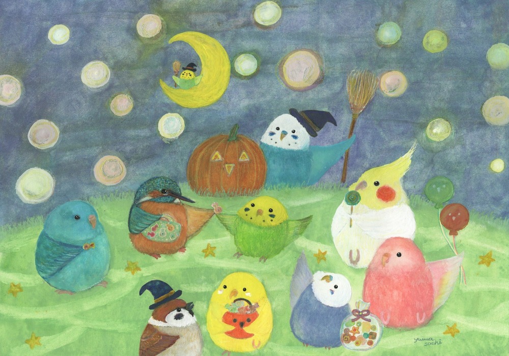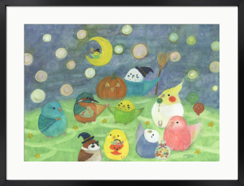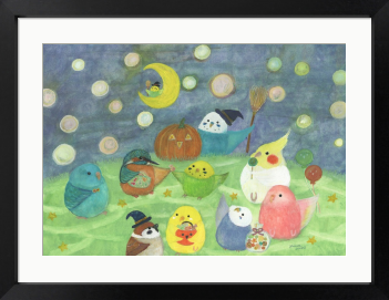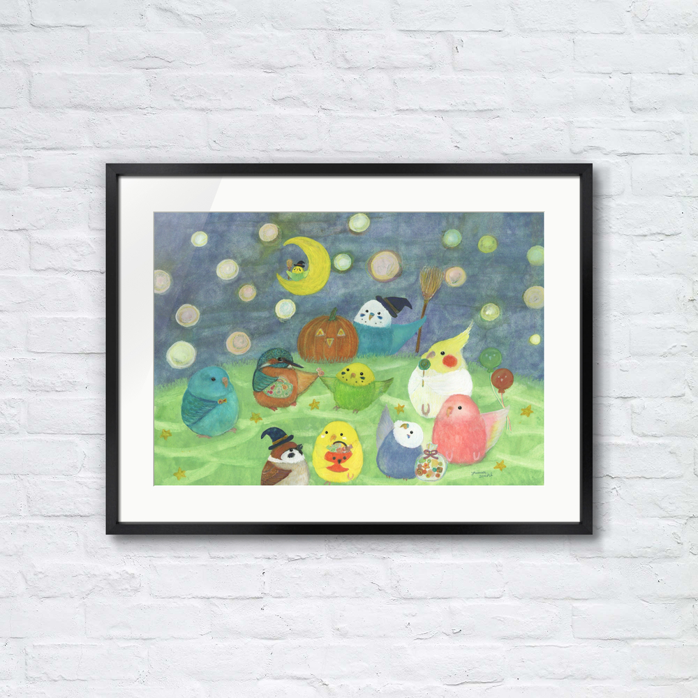 【ハロウィンインコたち】 鳥たちのかわいいハロウィンを描きました。 もしも…鳥たちの世界があったなら……。 自由に物語を想像していただけましたら幸いです。 お部屋に飾るインテリアアートとしてもおすすめの1枚です。