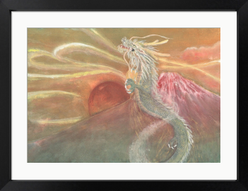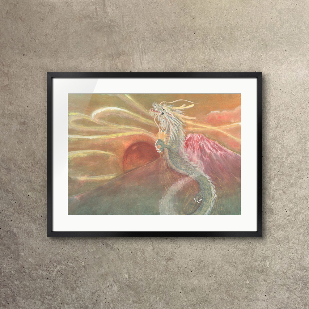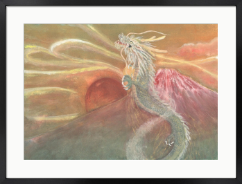 赤富士と昇り龍 赤富士と力強く昇る龍、日の出を描いた絵画です。