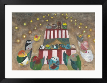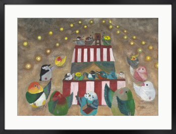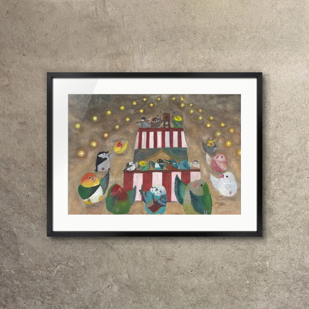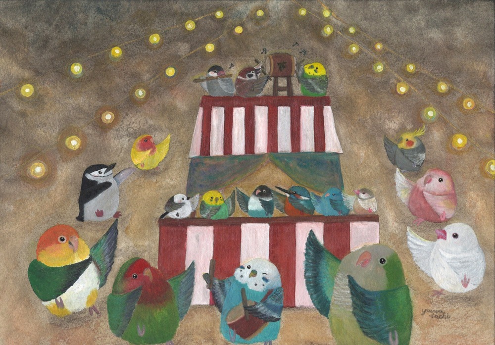盆踊りインコ お祭りで盆踊りを楽しむインコたち。 賑やかなおまつりの雰囲気が楽しめます。 どこか懐かしさも感じられる心なごむ絵画です。 もしも…鳥たちの世界があったなら……。 自由に物語を想像していただけましたら幸いです。 お部屋に飾るインテリアアートとしてもおすすめの1枚です。