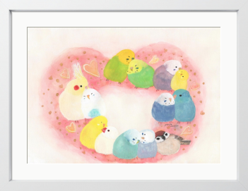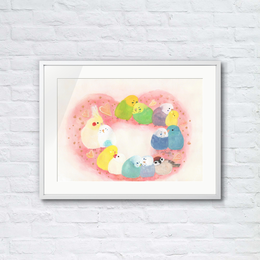 羽繕いインコたち 小鳥たちは仲良く羽繕いしています。 丸い小鳥たちの輪の形、リースの形は永遠の象徴とされており、 幸せがずっと続きますようにという願いが込められている心和む絵画です。 もしも…鳥たちの世界があったなら……。 自由に物語を想像していただけましたら幸いです。 お部屋に飾るインテリアアートとしてもおすすめの1枚です。