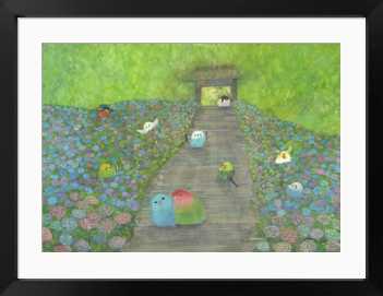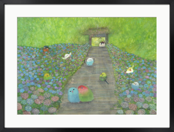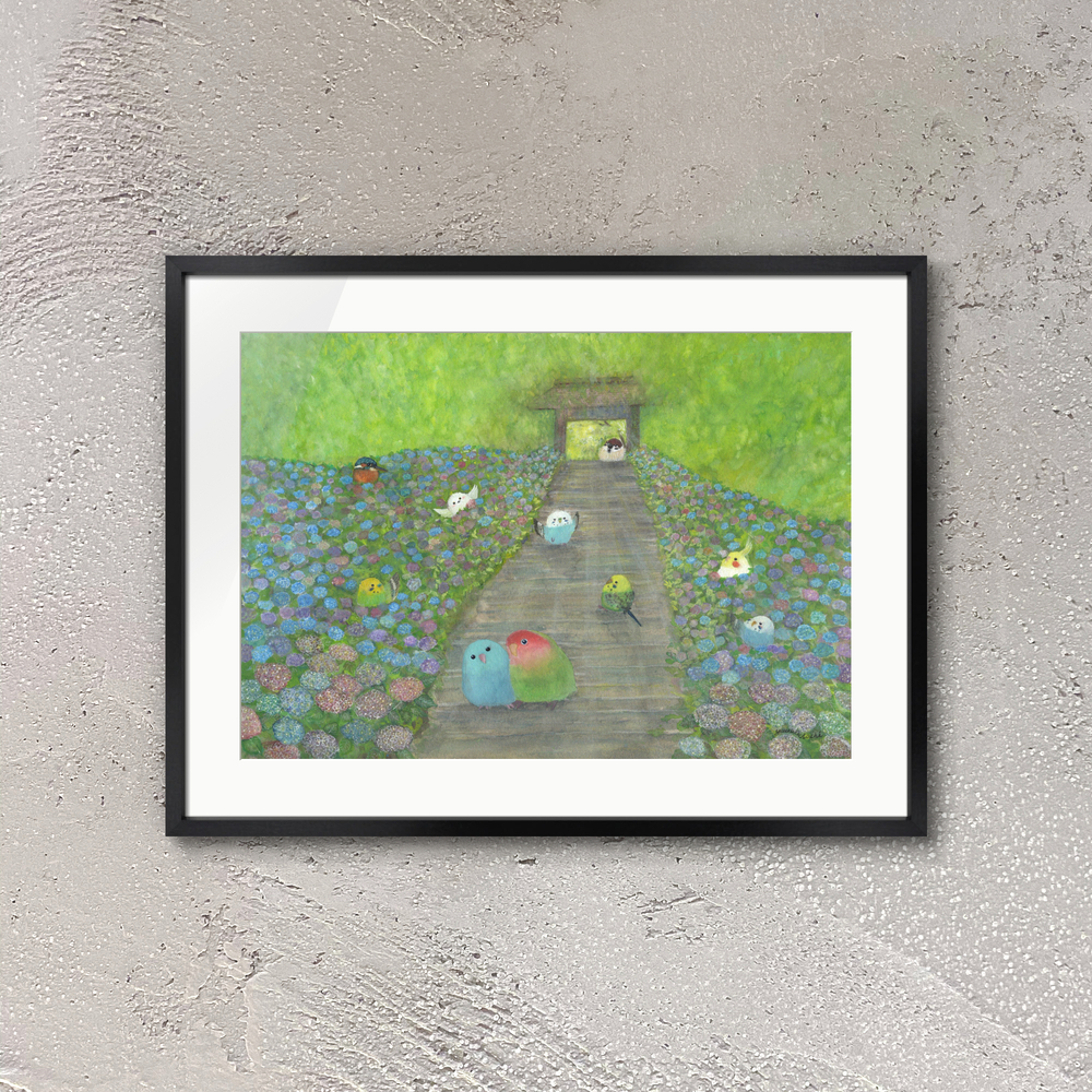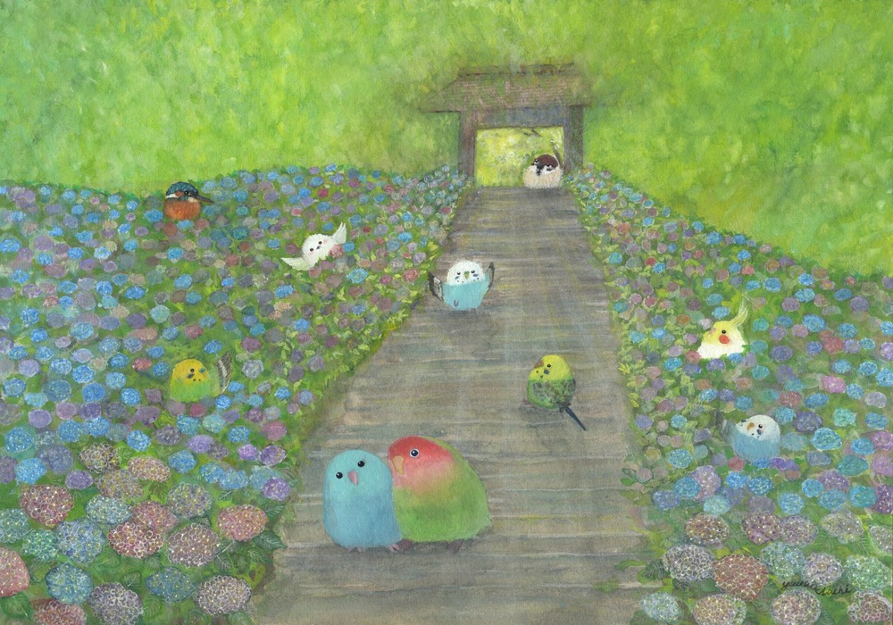 待ち合わせ 紫陽花が満開の紫陽花道を楽しむ小鳥たち。 それぞれが待ち合わせをしている可愛らしい絵画です。 もしも…鳥たちの世界があったなら……。 自由に物語を想像していただけましたら幸いです。 お部屋に飾るインテリアアートとしてもおすすめの1枚です。