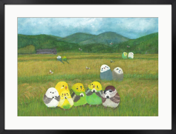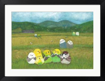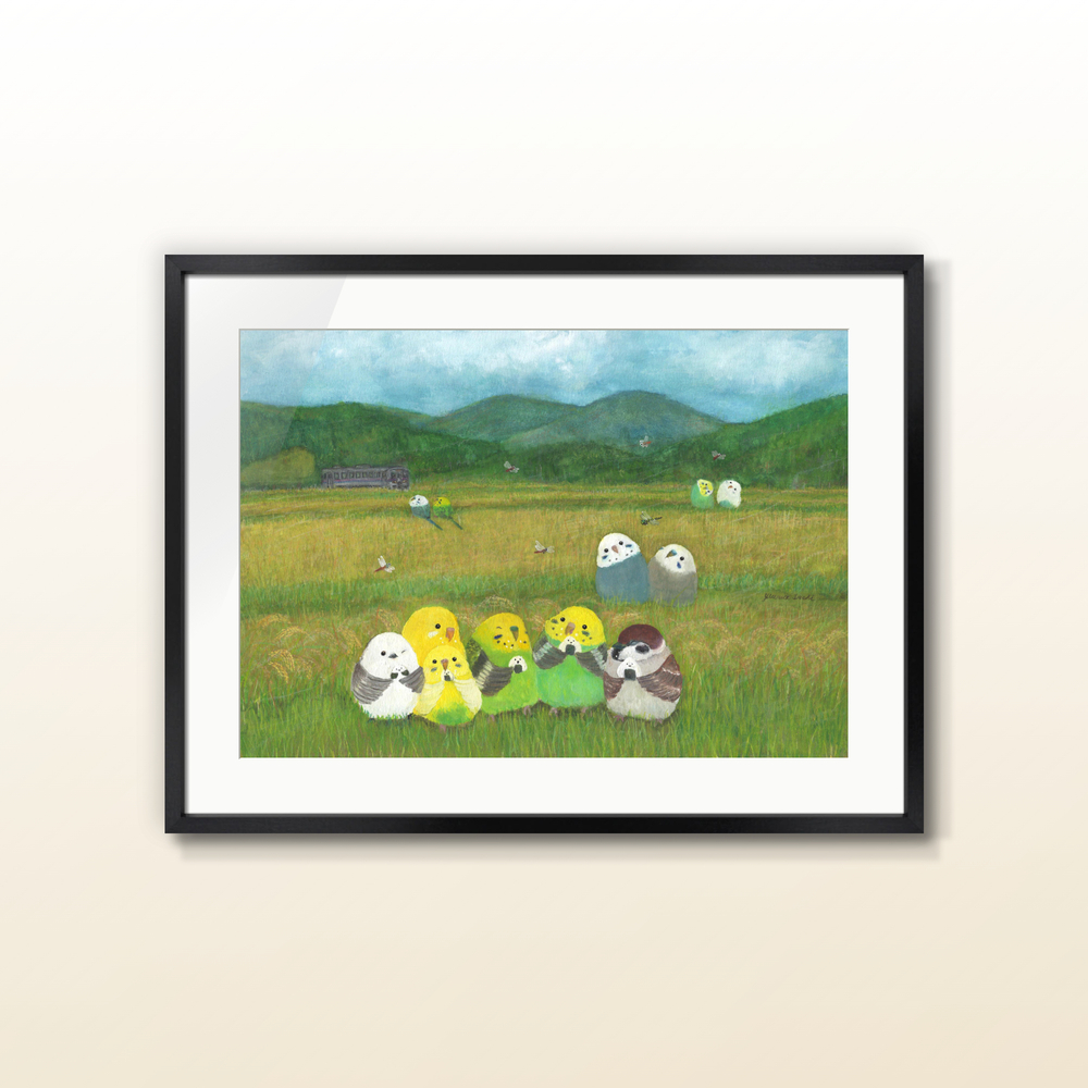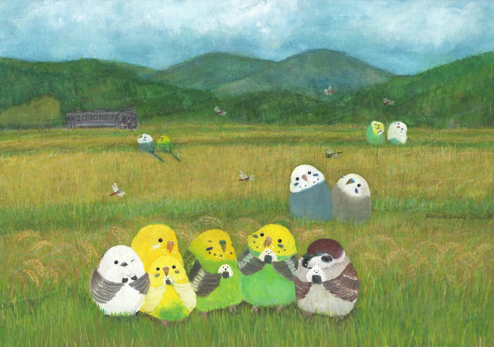おにぎりインコ 日本人のパワーフード『おにぎり』 インコたちもおにぎりを食べて元気一杯です。 背景には秋の田園風景と電車、山々、赤トンボ、オニヤンマなど心和む絵画です。